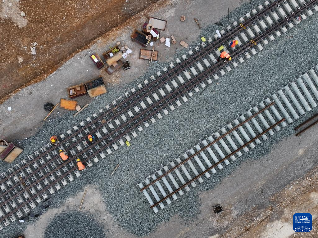 5月1日,中铁八局的建设者在位于贵州省贵安新区的贵南高铁引入贵阳枢纽工程现场进行铺轨施工(无人机照片)。新华社记者 刘续 摄