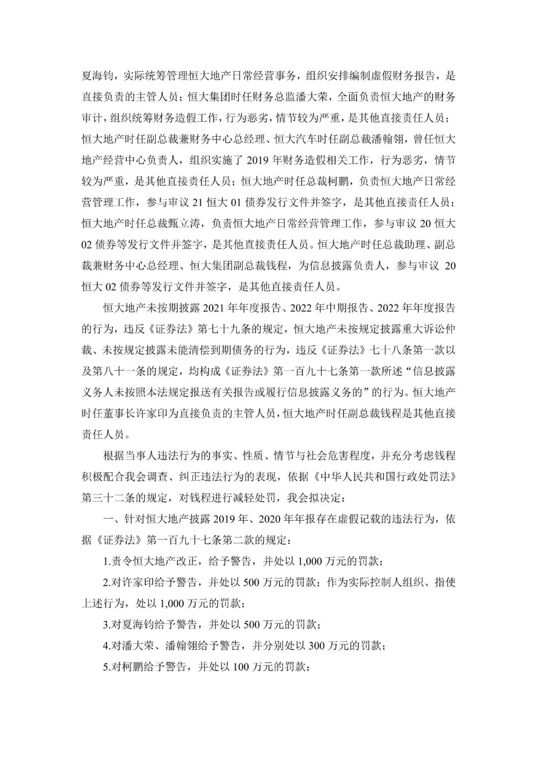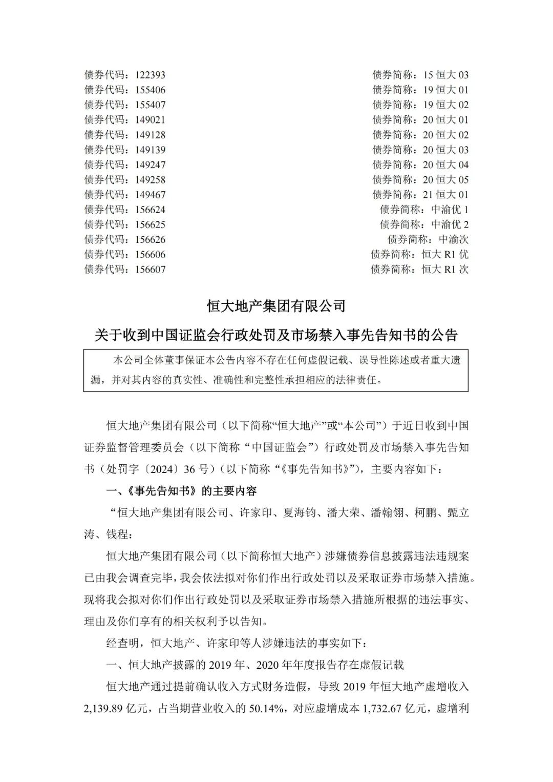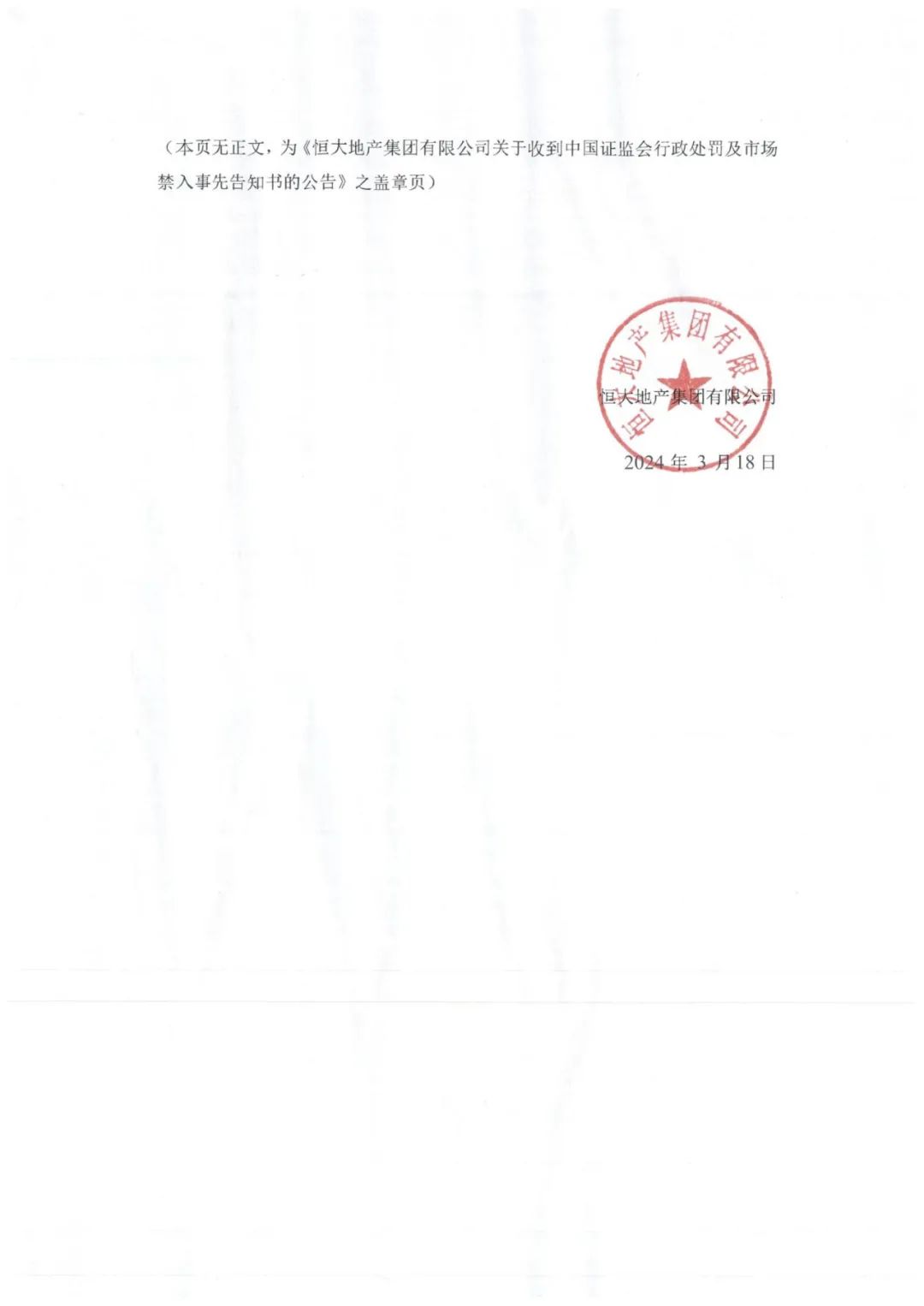 恒大地产收到证监会行政处罚及市场禁入事先告知书,针对恒大地产三项违法违规行为,证监会拟决定: