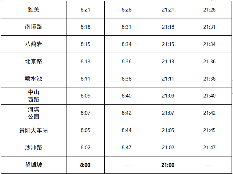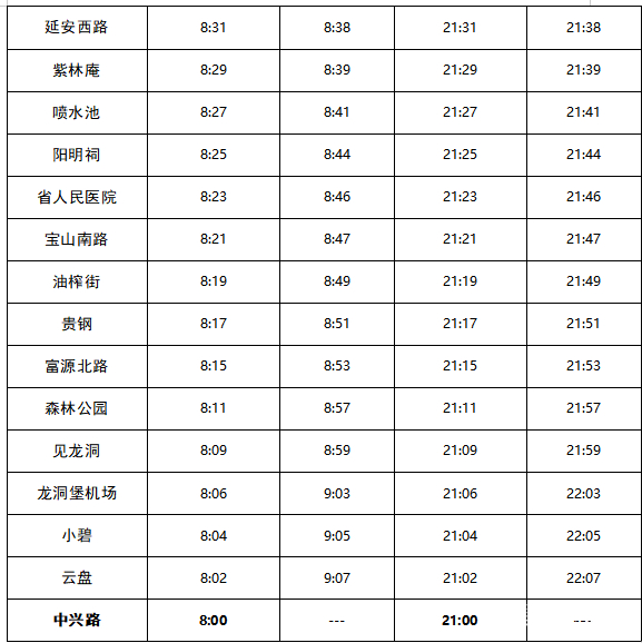 动静记者今天(9月5日)上午从贵阳市公共交通投资运营集团了解到,为疫情防控需要,自9月5日起贵阳地铁1、2号线执行新版运行图,运营服务时间调整为08:00-21:00,发车间隔调整为45分钟,1、2号线各站首末班车时刻见表1、表2。