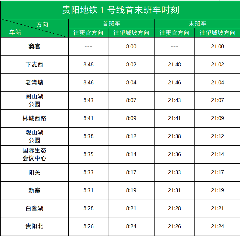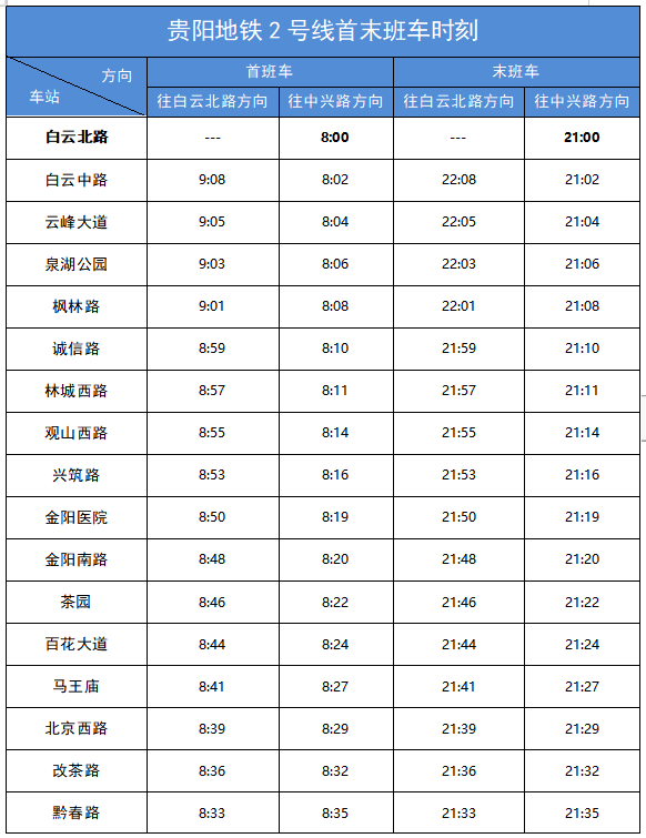 动静记者今天(9月5日)上午从贵阳市公共交通投资运营集团了解到,为疫情防控需要,自9月5日起贵阳地铁1、2号线执行新版运行图,运营服务时间调整为08:00-21:00,发车间隔调整为45分钟,1、2号线各站首末班车时刻见表1、表2。