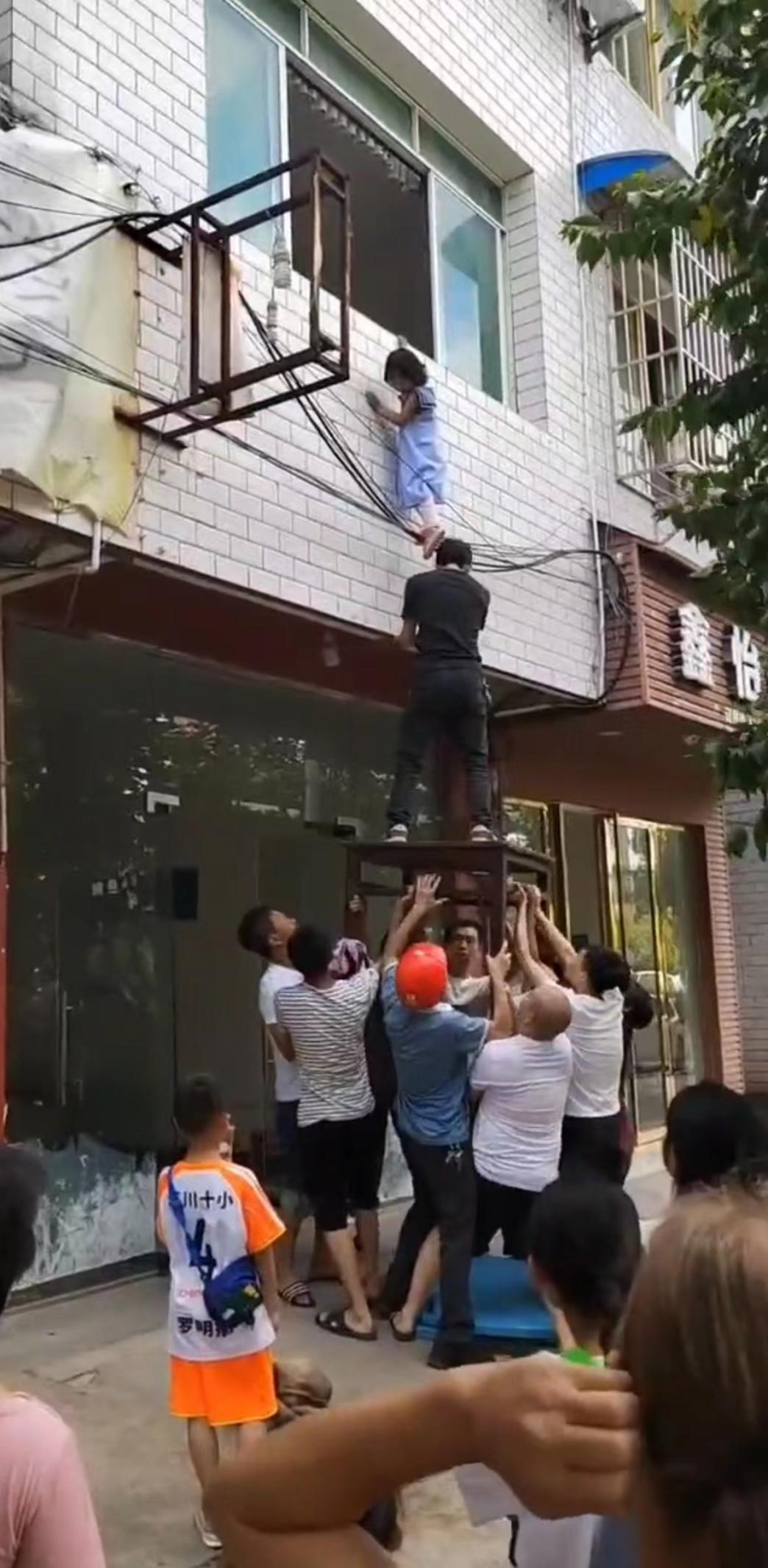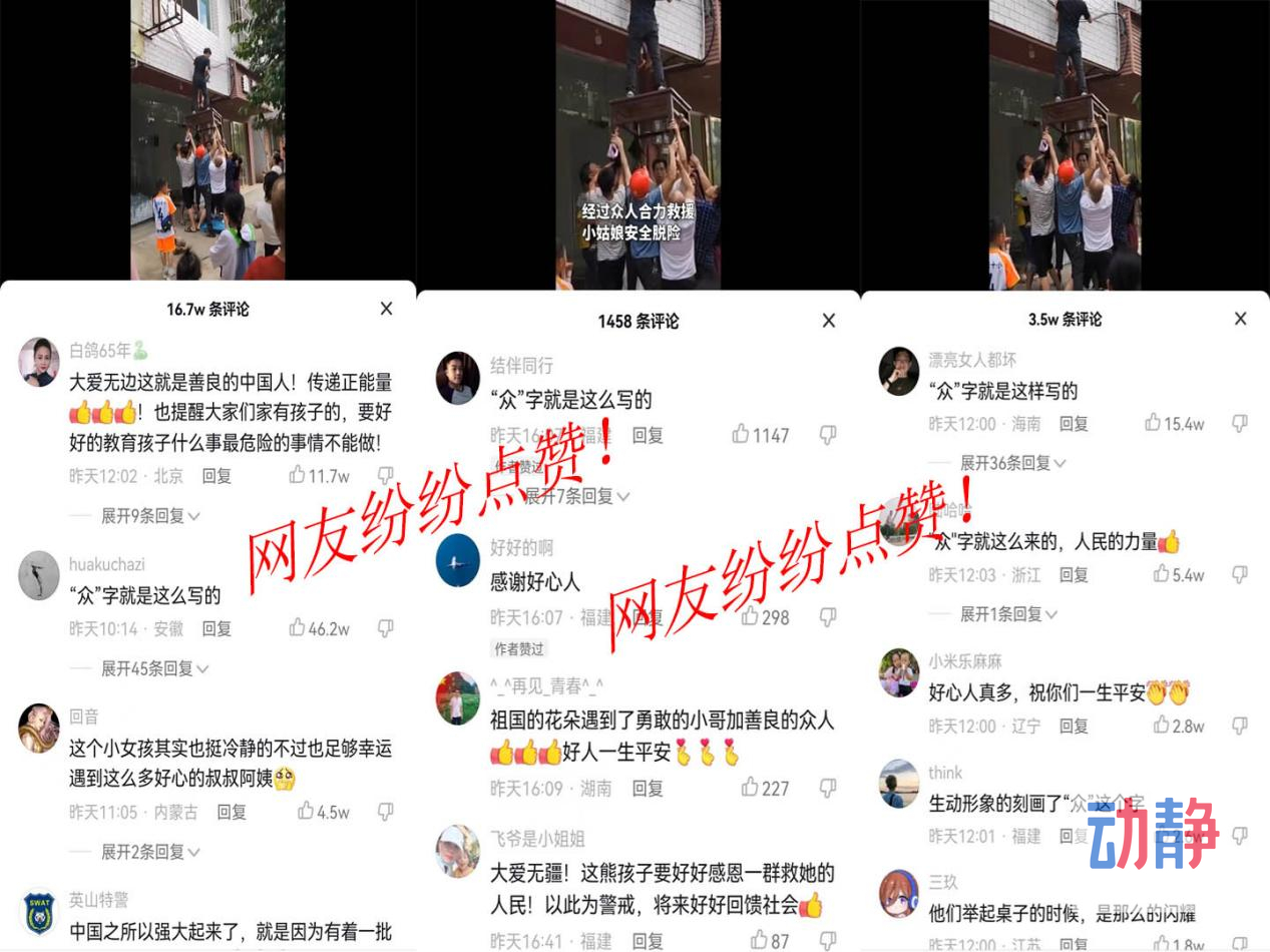 昨天,一条“贵州遵义小女孩挂外墙 众人搭人梯救下”的新闻登上了网络热搜。视频中,一个身穿蓝裙的小女孩单手吊在外墙,脚下踩着几根电线,一群人托举起一张木桌,一位黑衣男子站在桌上把女孩接住救下。网友们纷纷为这一场暖心的“托举”点赞。