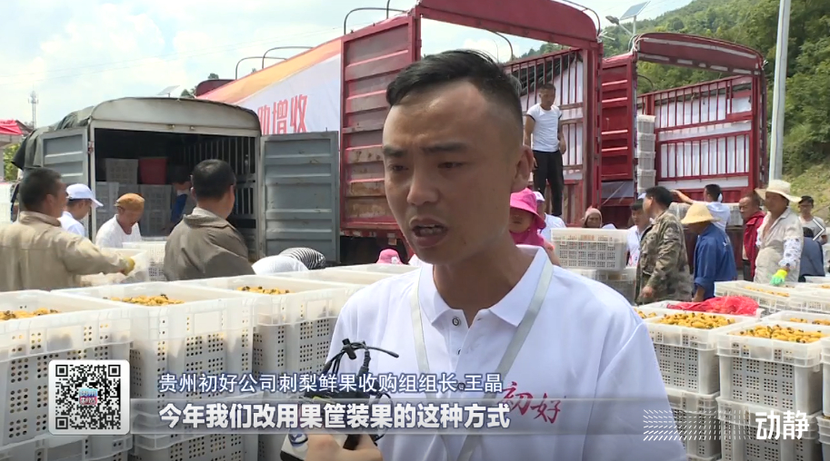 贵州初好公司刺梨鲜果收购组组长王晶说:“今年我们改用果筐装果的这种方式,便于存放,便于运输。采用小程序,对果筐进行管理,可以溯源果子的来源。”