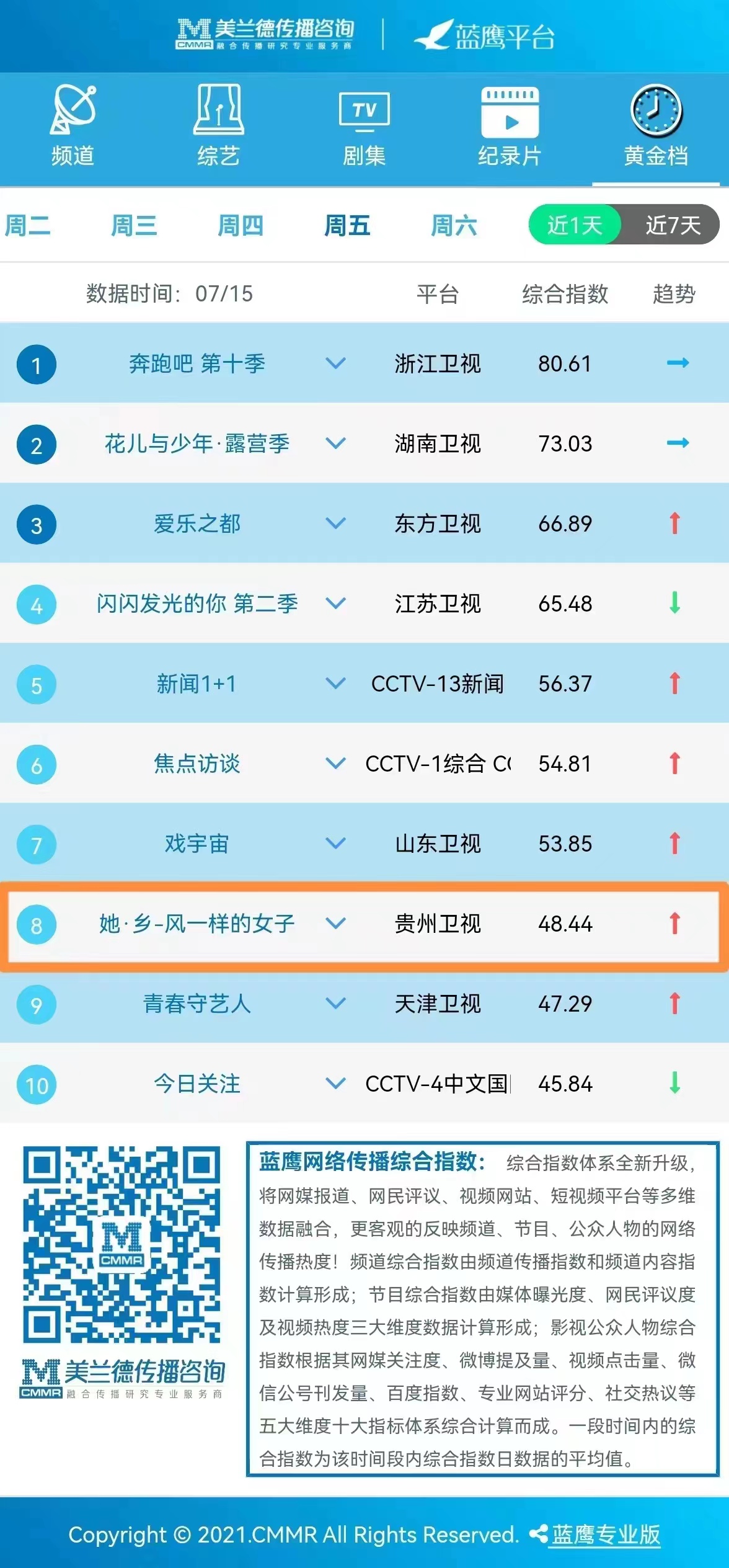 7月15日,全国首个"IPTV首播大型综艺节目"——《她·乡-风一样的女子》第一季(以下简称《她·乡》)正式收官。收官之日美誉度99.33,位列晚间黄金档电视节目融合传播指数榜第八。