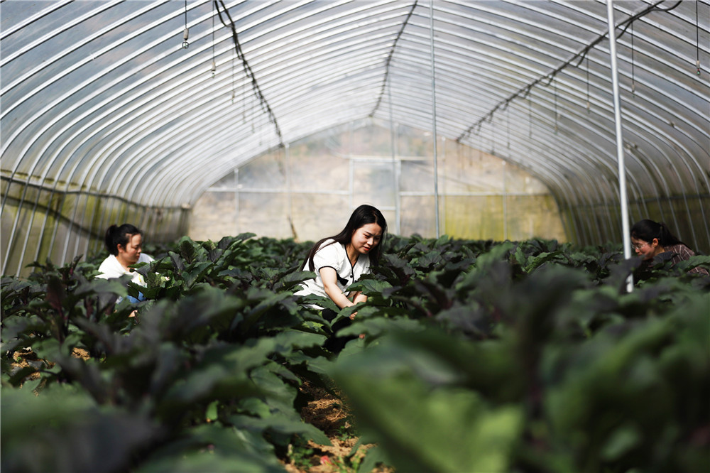2022年5月25日,农技人员在贵州省黔西市林泉镇林泉社区种植茄子的科技智慧大棚里除草、打芽、疏花、检果。