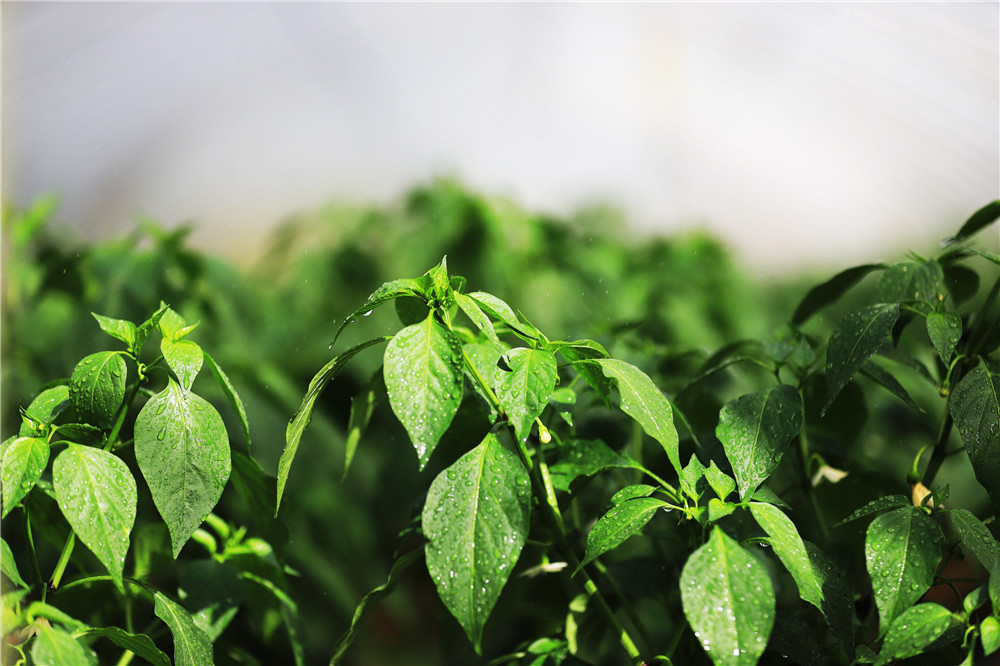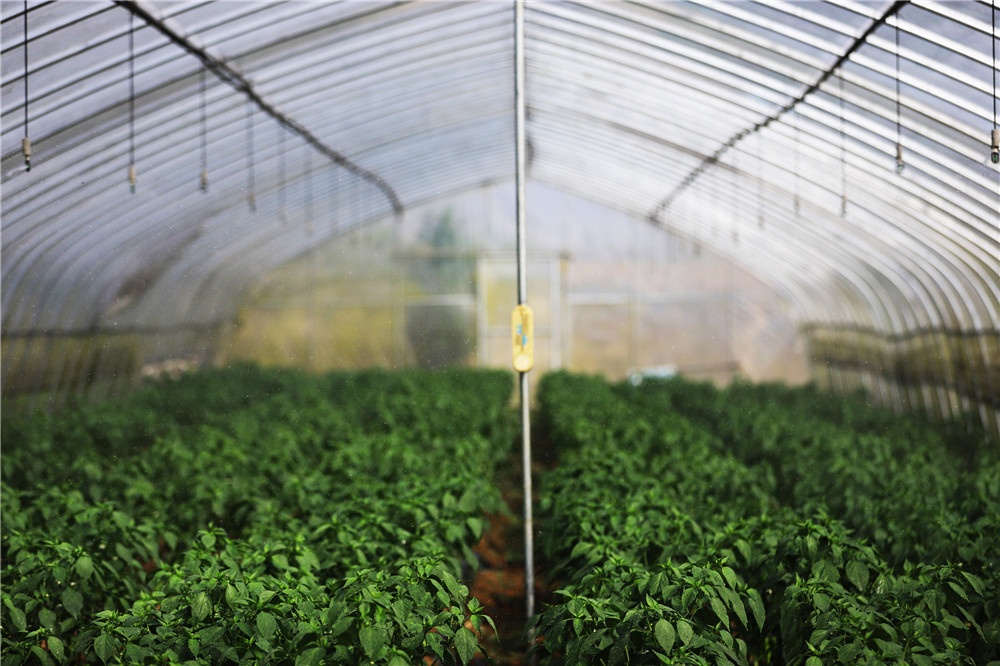 2022年5月25日,贵州省黔西市林泉镇林泉社区种植辣椒的科技智慧大棚里在自动浇水。