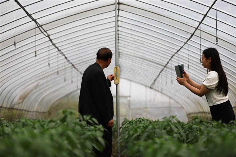 2022年5月25日,农技人员在贵州省黔西市林泉镇林泉社区种植辣椒的科技智慧大棚里观察、记录温度和湿度。