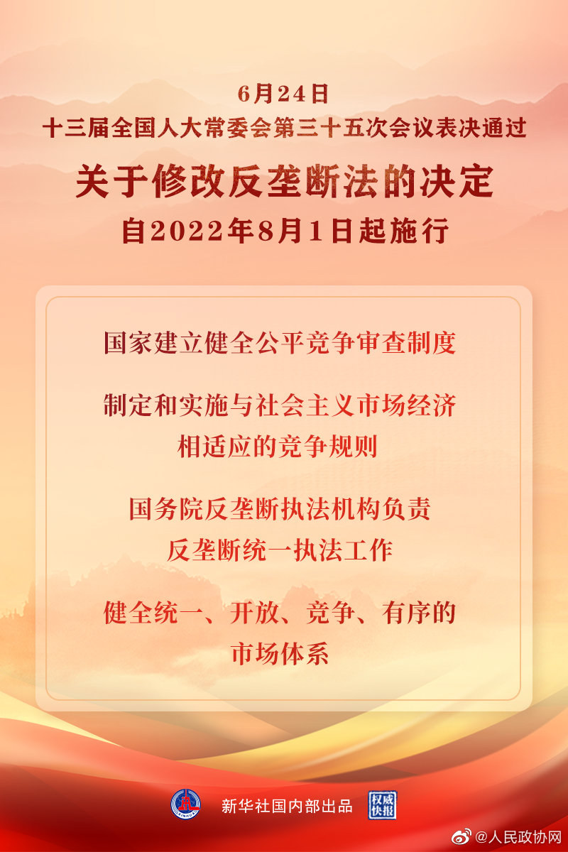 ▲十三届全国人大常委会第三十五次会议24日表决通过关于修改反垄断法的决定,自2022年8月1日起施行。