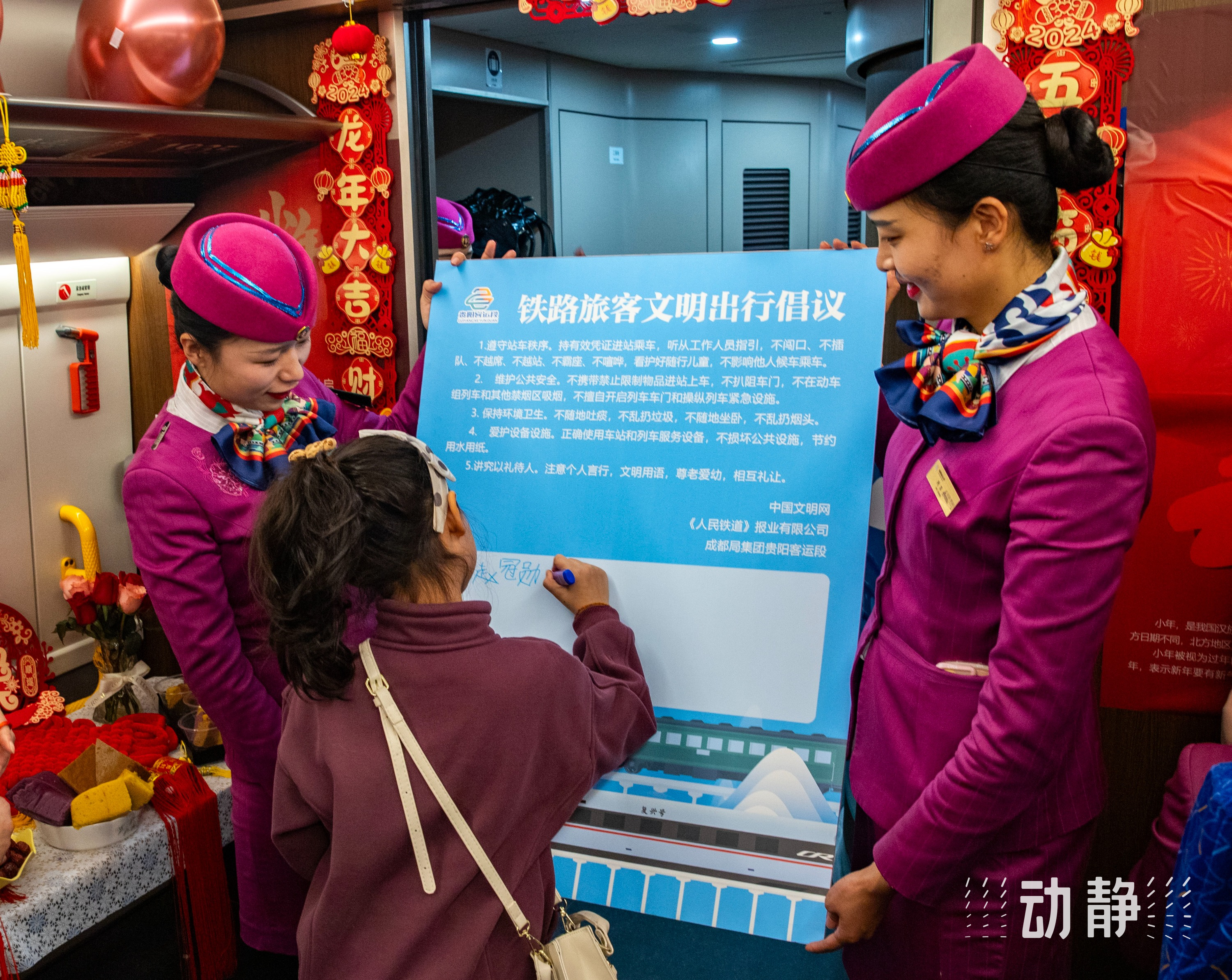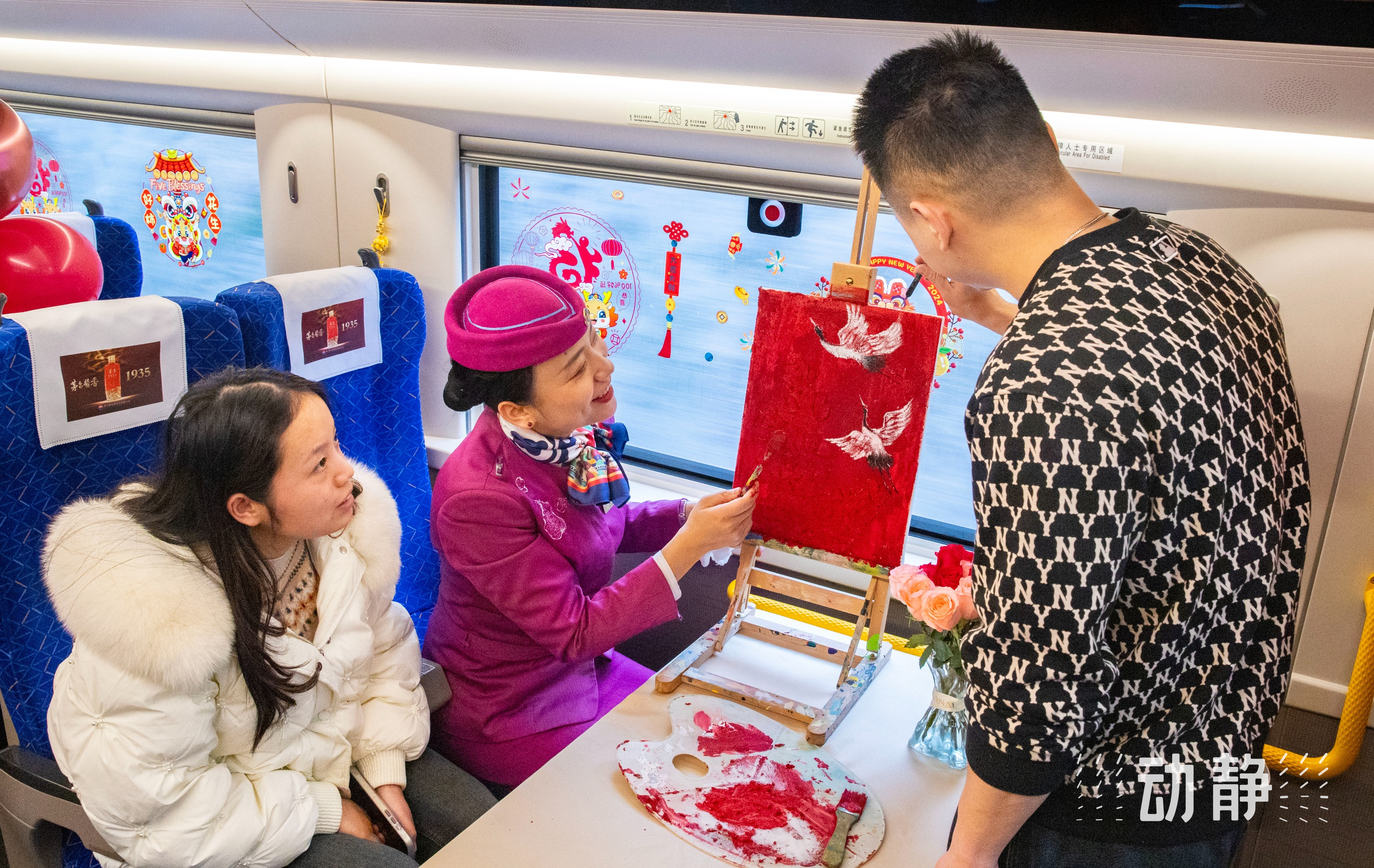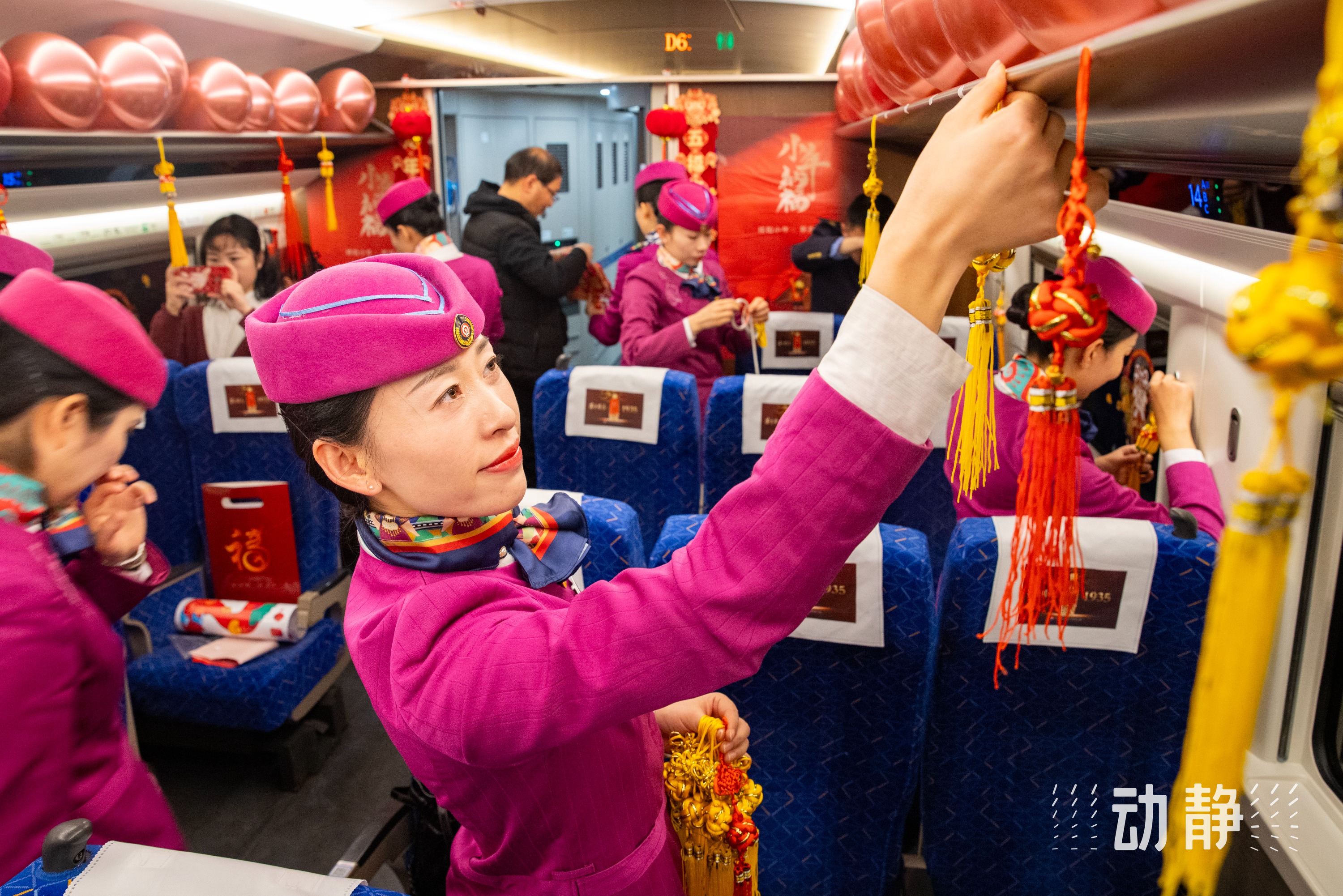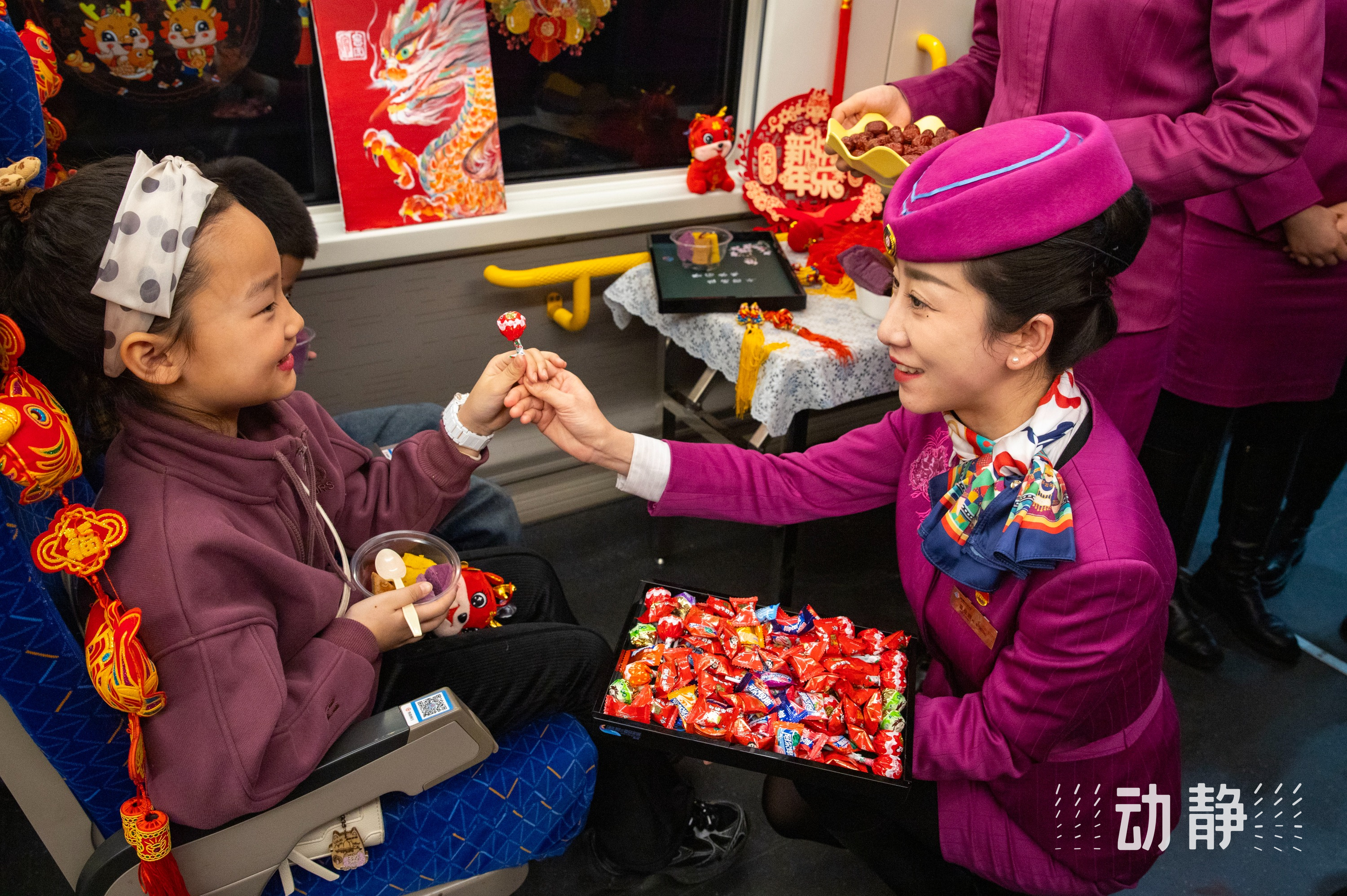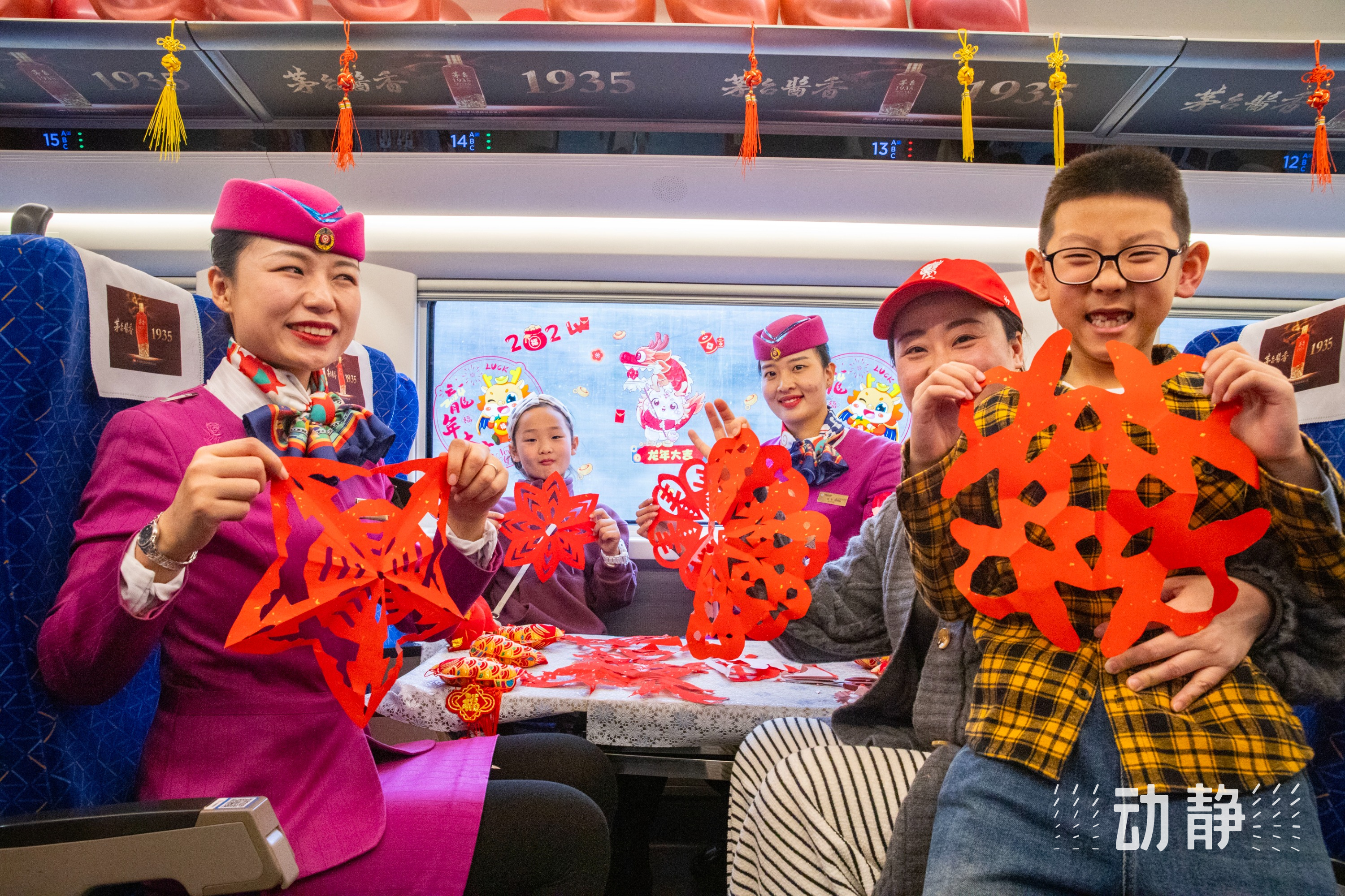 2月2日,贵阳北开往荔波的D6165次复兴号上,喜庆的布置、多样的活动、热闹的氛围,吸引着旅客参与到小年民俗活动中。