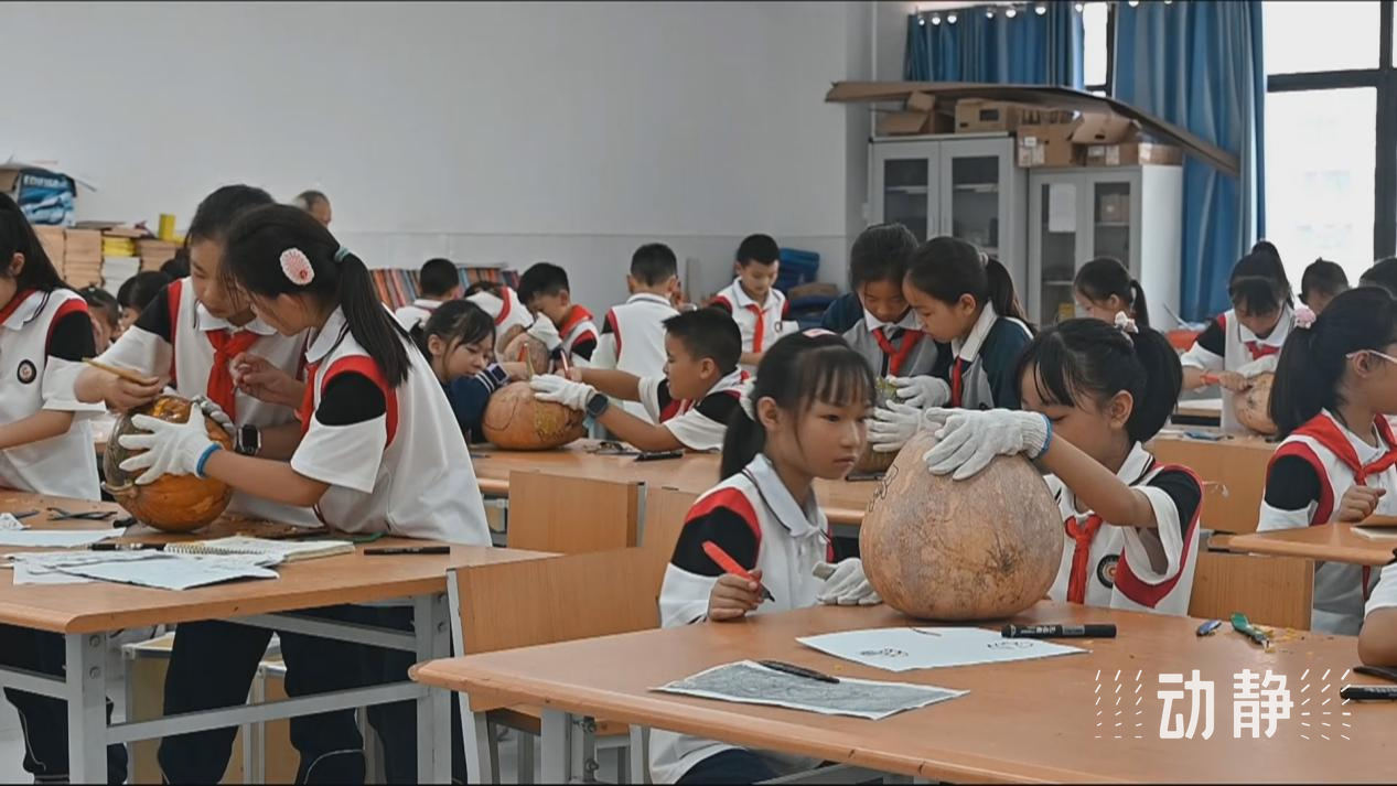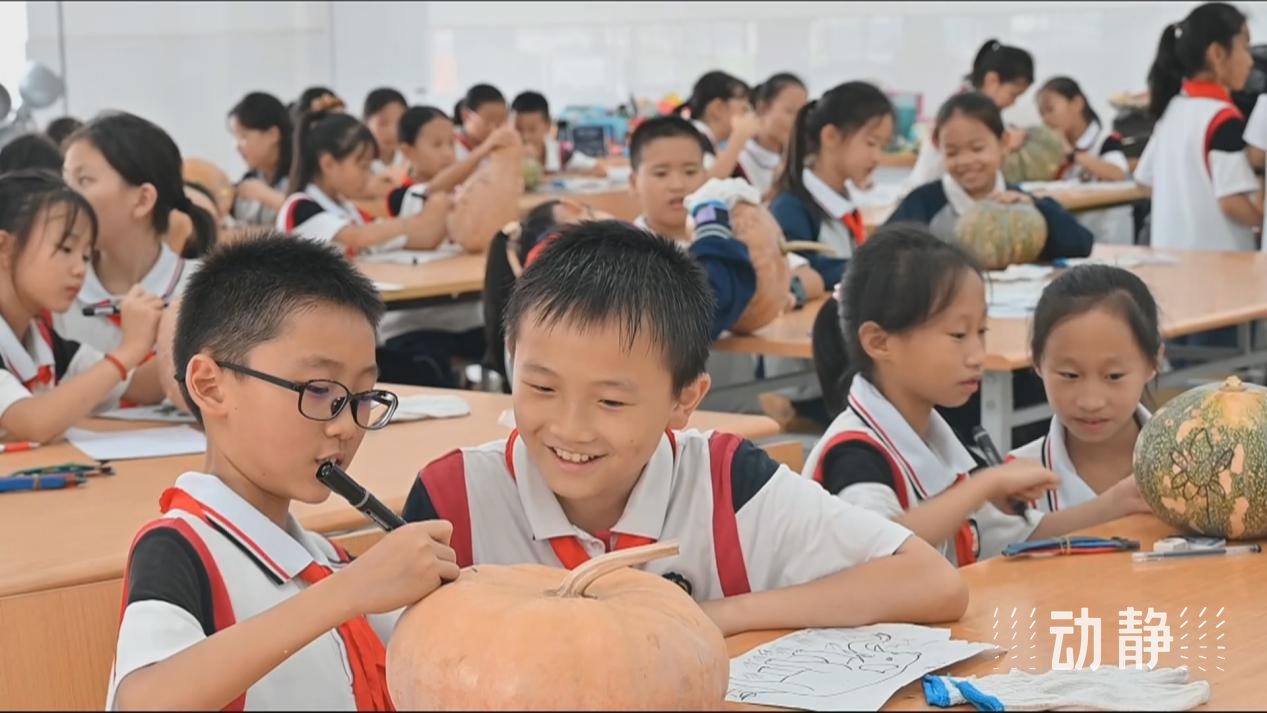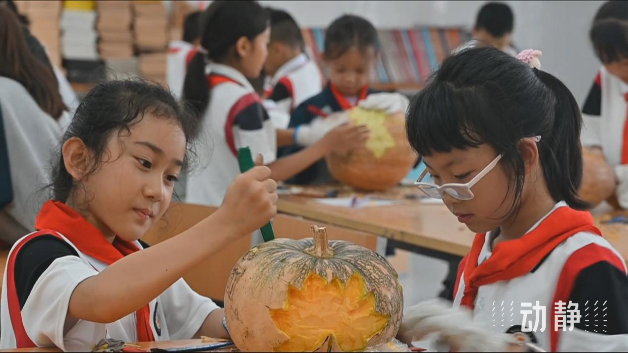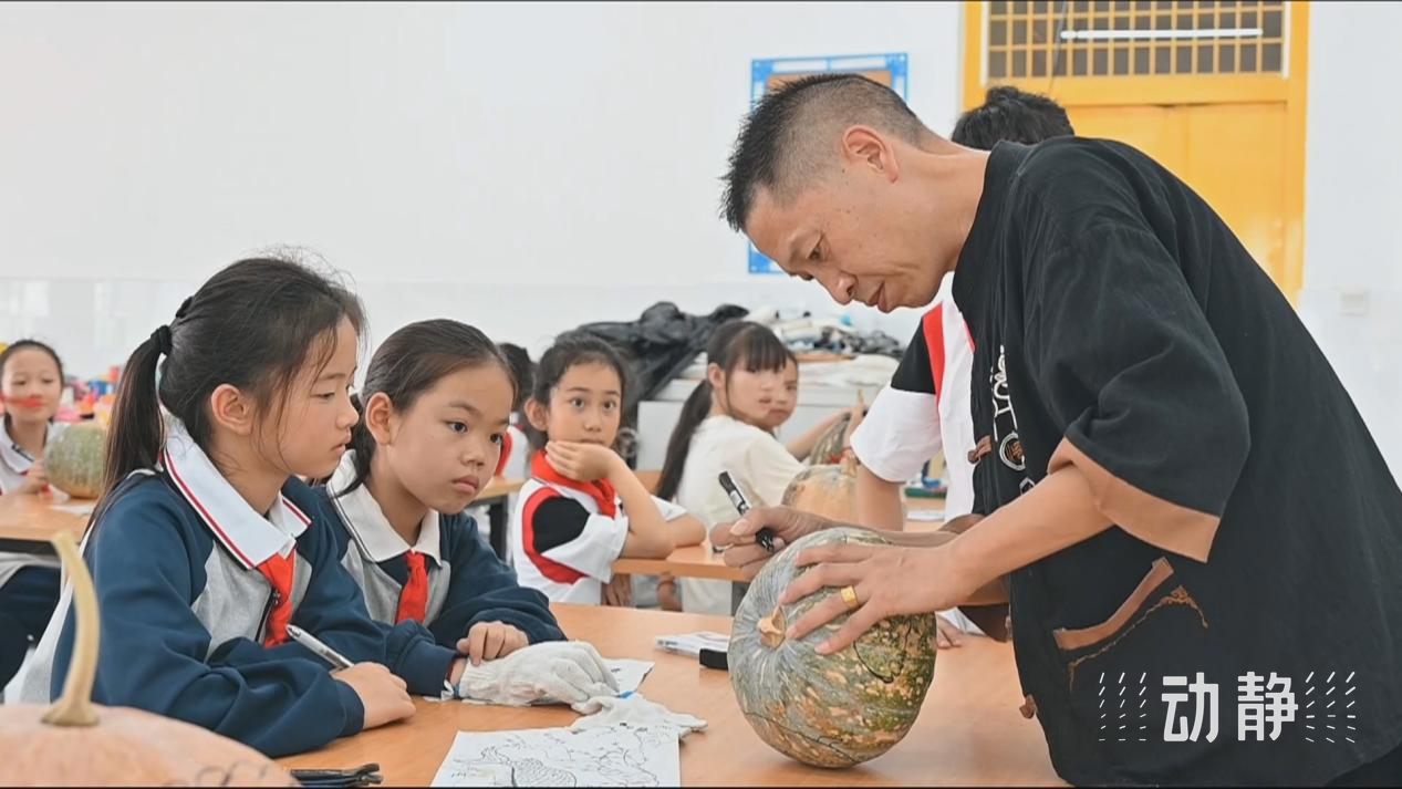 在贵阳市清镇市时光实验学校,非遗传承人黄国林、黄明云正在手把手地向同学们传授瓜灯雕刻技艺。同学们在老师的指导下,运用“刻、镂、刮、挑”等技法,将一块块南瓜雕琢成形态万千、栩栩如生的瓜灯。