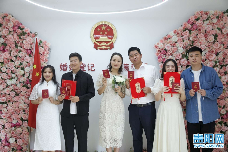 5月20日,谐音“我爱你”,是很多新人眼中的“吉日”,贵阳各区(县、市)迎来结婚登记高峰,各婚姻登记处“为爱加班”。据初步统计,当天,贵阳贵安领证的新人超过1100对,比平时陡增4倍左右。