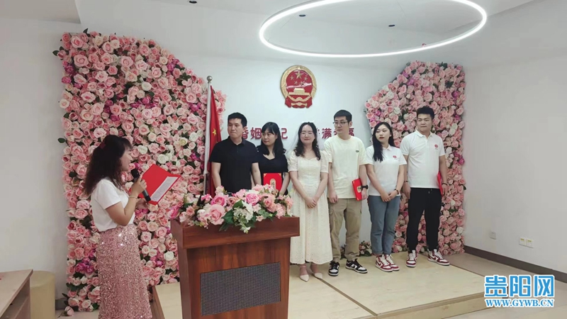 为了祝福新人,让他们感悟和铭记婚姻家庭蕴含的责任担当,南明区婚姻登记处为部分新人举行了庄严的颁证仪式,还联手相关单位,为新人们送上“爱的礼包”。