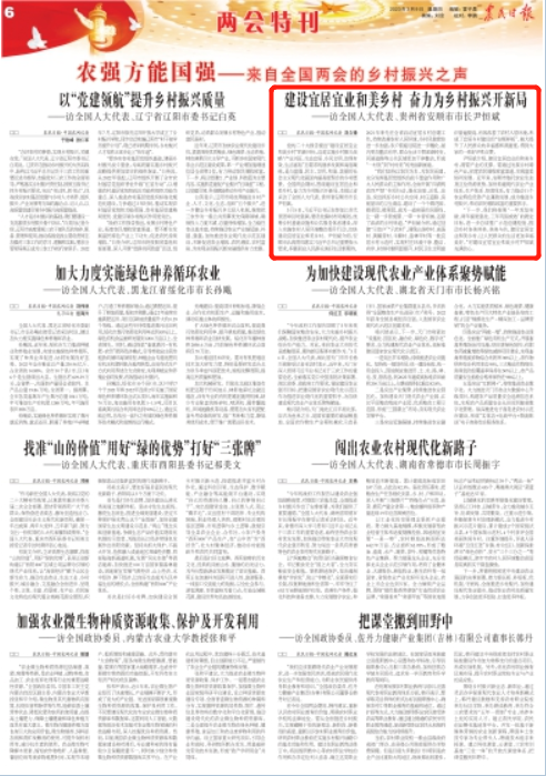 党的二十大报告提出“建设宜居宜业和美乡村”的新目标,这是实施乡村振兴战略“产业兴旺、生态宜居、乡风文明、治理有效、生活富裕”总要求的继承发展和高度凝练,是与富强、民主、文明、和谐、美丽的社会主义现代化强国内涵高度契合的乡村愿景。全国两会期间,围绕建设宜居宜业和美乡村,奋力为乡村振兴开新局,本报记者采访了全国人大代表、贵州省安顺市市长尹恒斌。