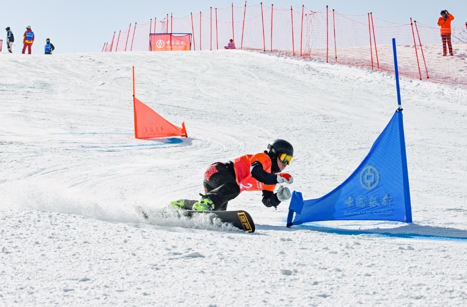2月3日,明日之星·2022—2023中国银行中国青少年滑雪公开赛天津站比赛在天津盘山滑雪举办,当日进行了单板滑雪大回转项目的角逐。