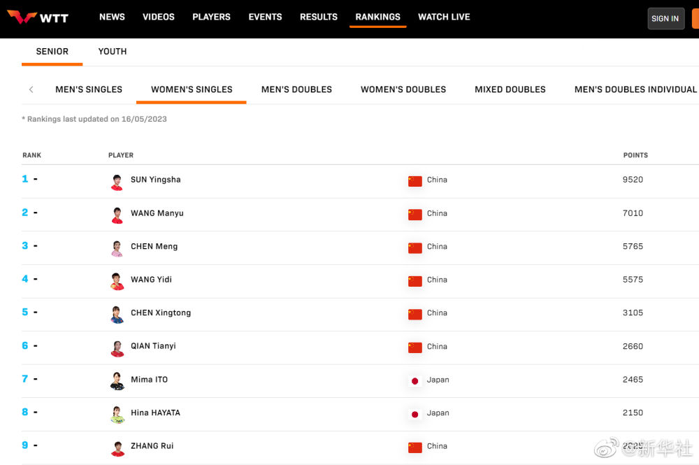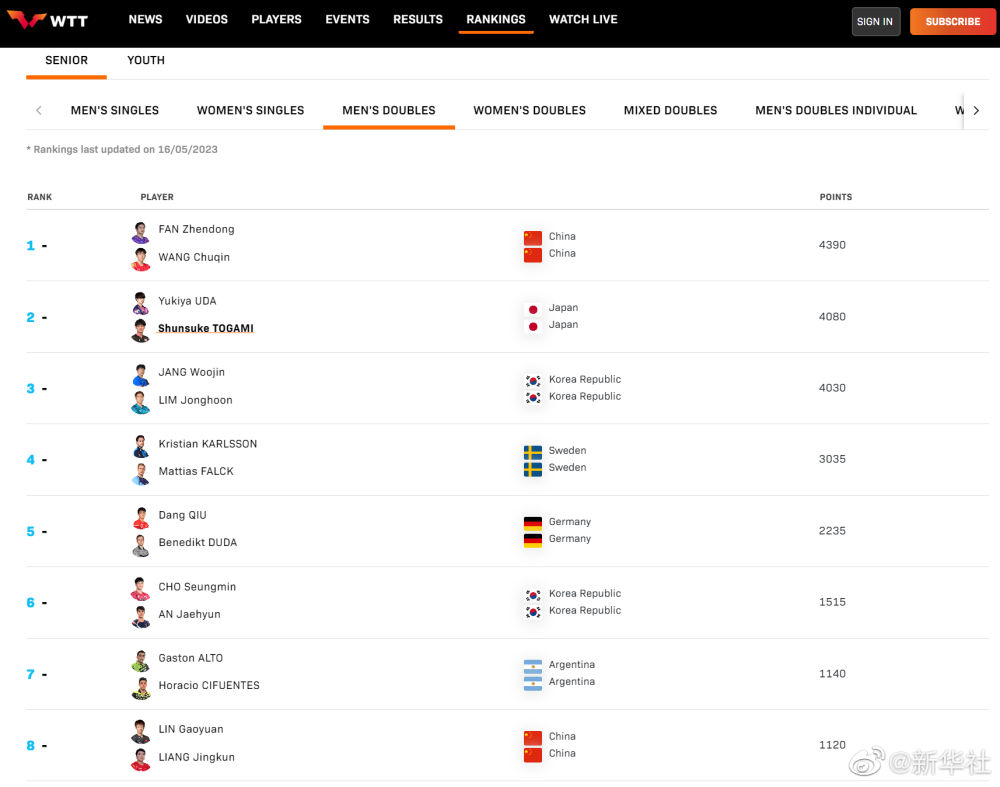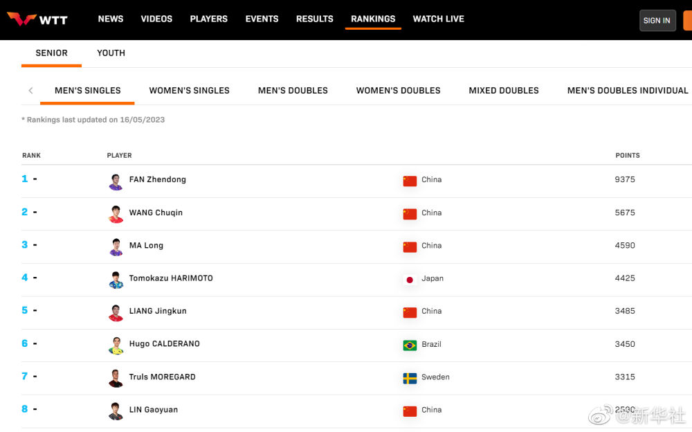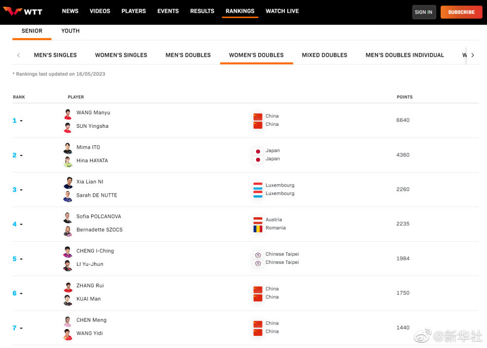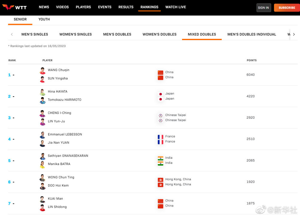 国际乒联公布2023年第20周世界排名。在单打方面,樊振东、王楚钦、马龙包揽男单前三;孙颖莎、王曼昱、陈梦包揽女单前三。在双打项目上,樊振东/王楚钦、王曼昱/孙颖莎分列男、女双打第一名,王楚钦/孙颖莎高居混双榜首。5月20日至28日,2023德班世乒赛举行,国乒最强阵容出战德班世乒赛,一起为国乒加油!