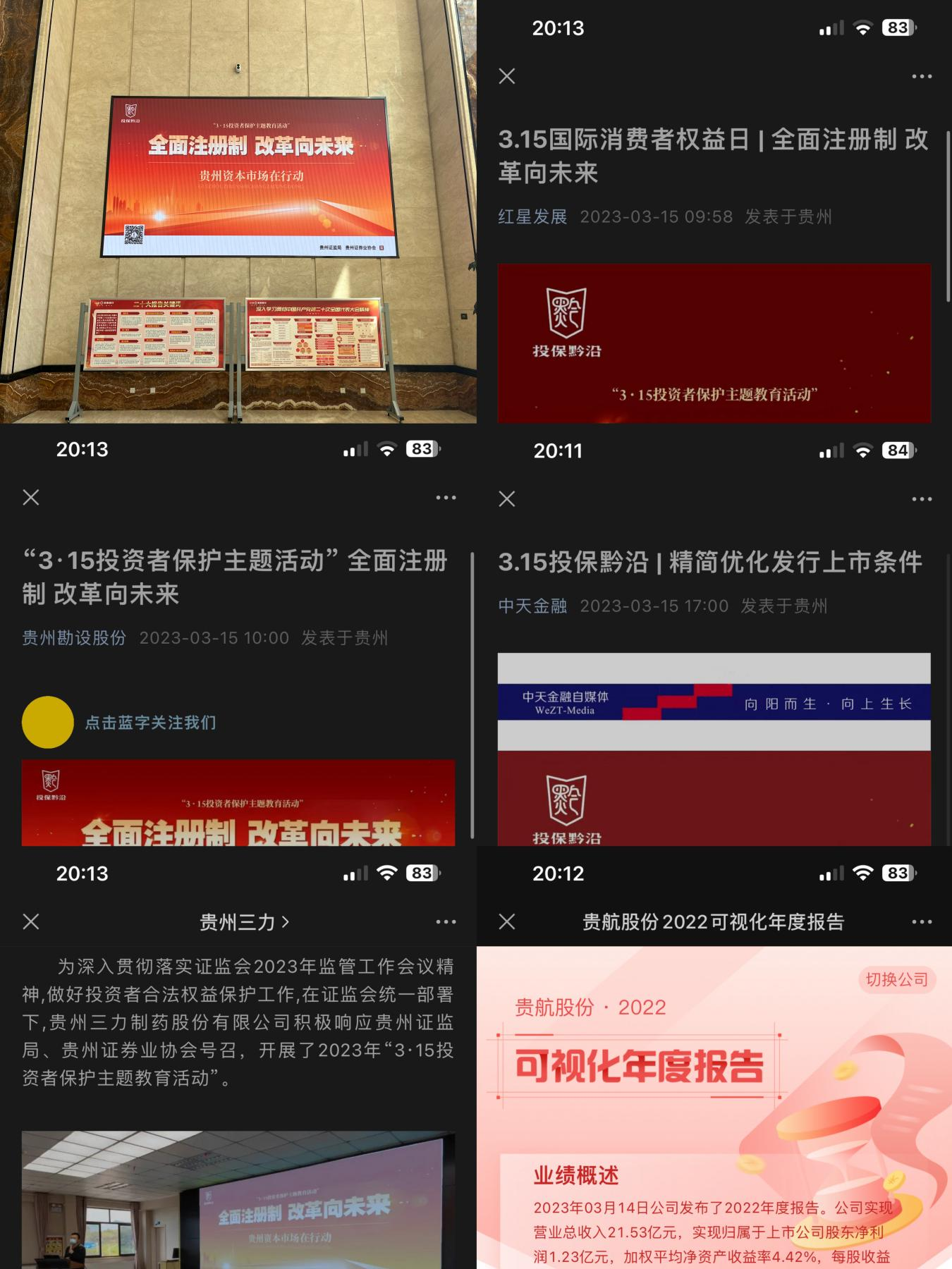 在“动静贵州”新闻客户端开设《聚焦全面实行注册制》专题,围绕全面注册制改革、上市公司高质量发展、投资者教育和保护等内容持续发布新闻素材,引导群众全面了解股票发行注册制,持续做好贵州资本市场新闻宣传与舆论引导工作。此外,辖区市场主体充分发挥一线阵地优势,通过网站、微信公众号、短信平台等媒体推送投资者保护和风险提示词条,利用商业地标电子屏、跑马屏滚动播放宣传标语,覆盖各类人群,营造了良好的投资者保护氛围。