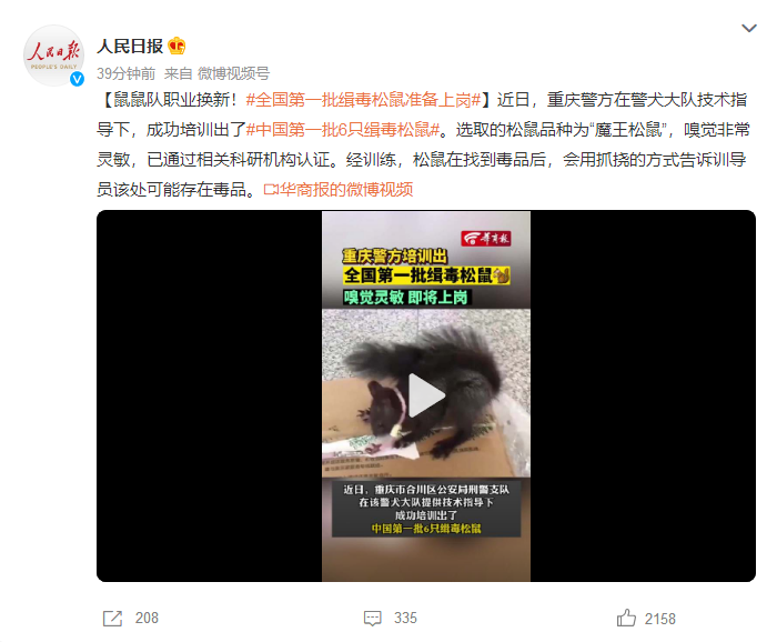 近日,重庆警方在警犬大队技术指导下,成功培训出了中国第一批6只缉毒松鼠。选取的松鼠品种为“魔王松鼠”,嗅觉非常灵敏,已通过相关科研机构认证。经训练,松鼠在找到毒品后,会用抓挠的方式告诉训导员该处可能存在毒品。