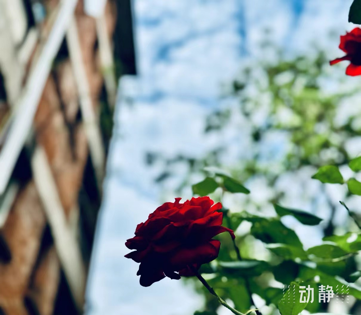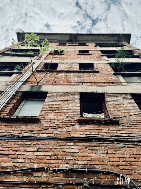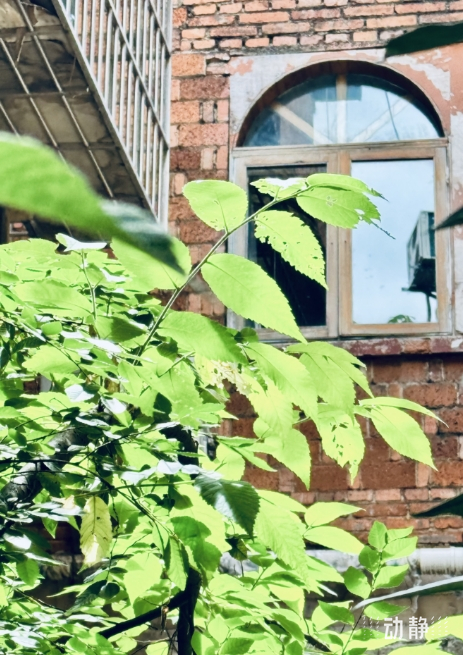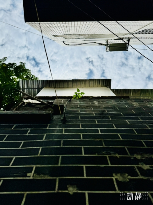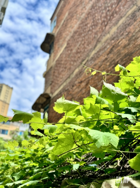 正对面,有一面很高的墙。墙砖的痕迹应该是近几年改造更新留下的。墙内的绿植又发了新芽,主人应该是很用心地在打理。