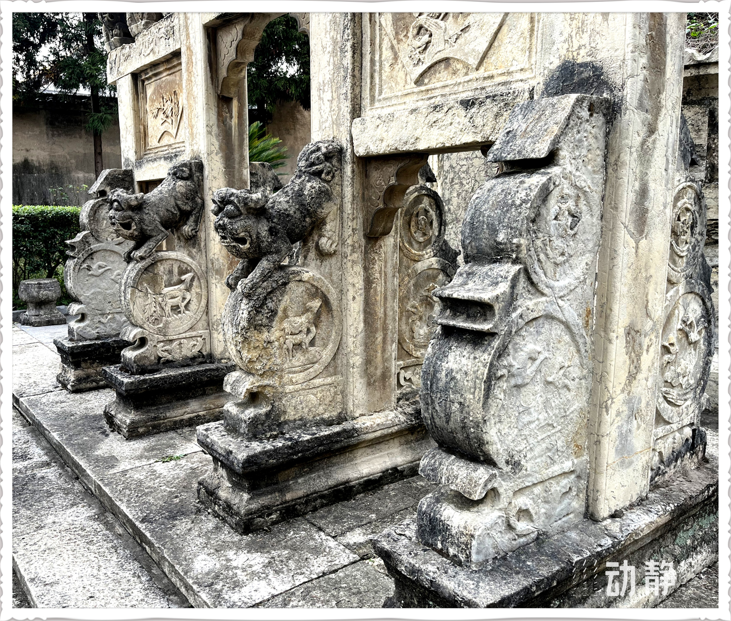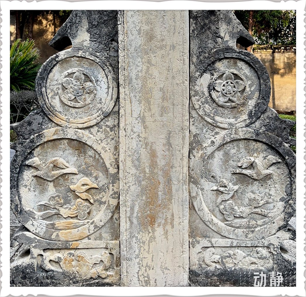 两次间上方称次匾,浮雕竹雀图和喜鹊登梅图,均为扇形。竹子刚直不阿有气节,梅花遒劲刚挺有骨力。次匾上方石梁,磨砺坚硬,浮雕松鹤图,寓意坚韧不拔。石梁上方,各雕三座狮托,嘴露利齿,双目圆睁,颈系铃,狮首向内侧倾斜。狮托之间空隙可透风,解决石坊的风荷载。狮托头顶次楼,楼檐滴水清晰可辨,楼脊内侧雕饰花草站角,与主楼中柱榫卯固定。主楼明间正匾,阴刻楷书“明十八先生墓”六字,下石梁两端有四连弧蝶形雀替(托角)装饰,浅浮雕蕉叶纹。正匾上方石梁,浮雕双凤朝阳图。石梁上方,雕四座狮托,托顶主楼。主楼与次楼做法相同,用一块边角起翘的厚石板表示屋面。因位置最高,遭雨水侵蚀更甚,石头的颜色明显比其他部位要黑些。