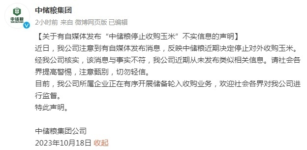 10月18日,中储粮集团公司发布《关于有自媒体发布“中储粮停止收购玉米”不实信息的声明》,全文如下: