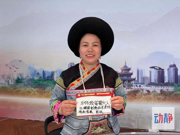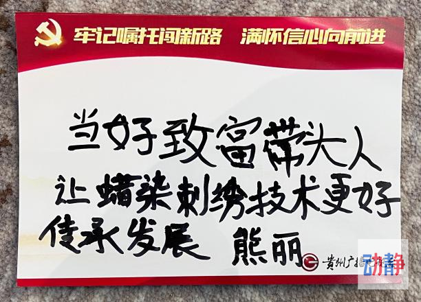 省党代会代表、毕节市纳雍县弯子村党支部支委委员、凤之梦蜡染刺绣厂厂长熊丽写下:当好致富带头人,让蜡染刺绣技术更好地传承发展。