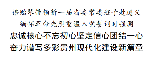 在遵义会议会址侧面广场,“大力弘扬‘坚定信念、坚持真理、独立自主、团结统一’的遵义会议精神”红底金字的巨幅标语十分醒目。面向鲜红的党旗,谌贻琴带领新一届省委常委班子重温入党誓词。