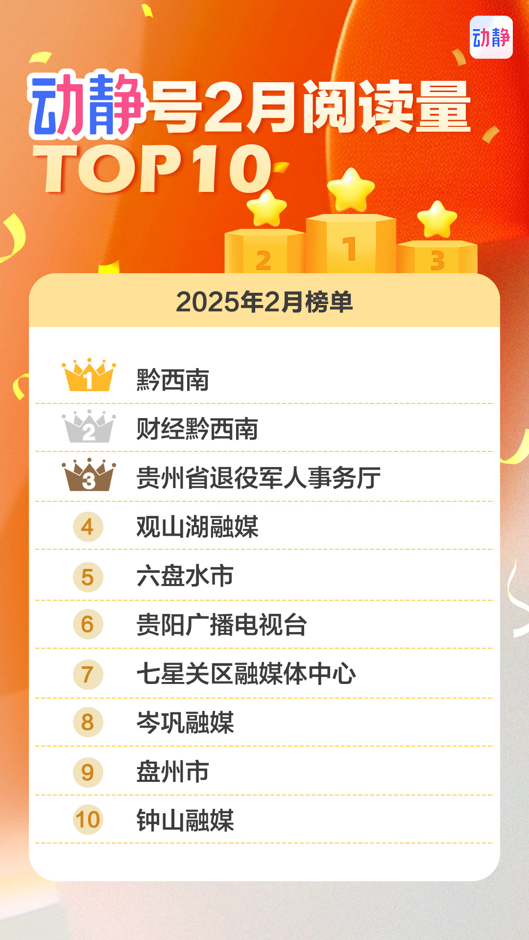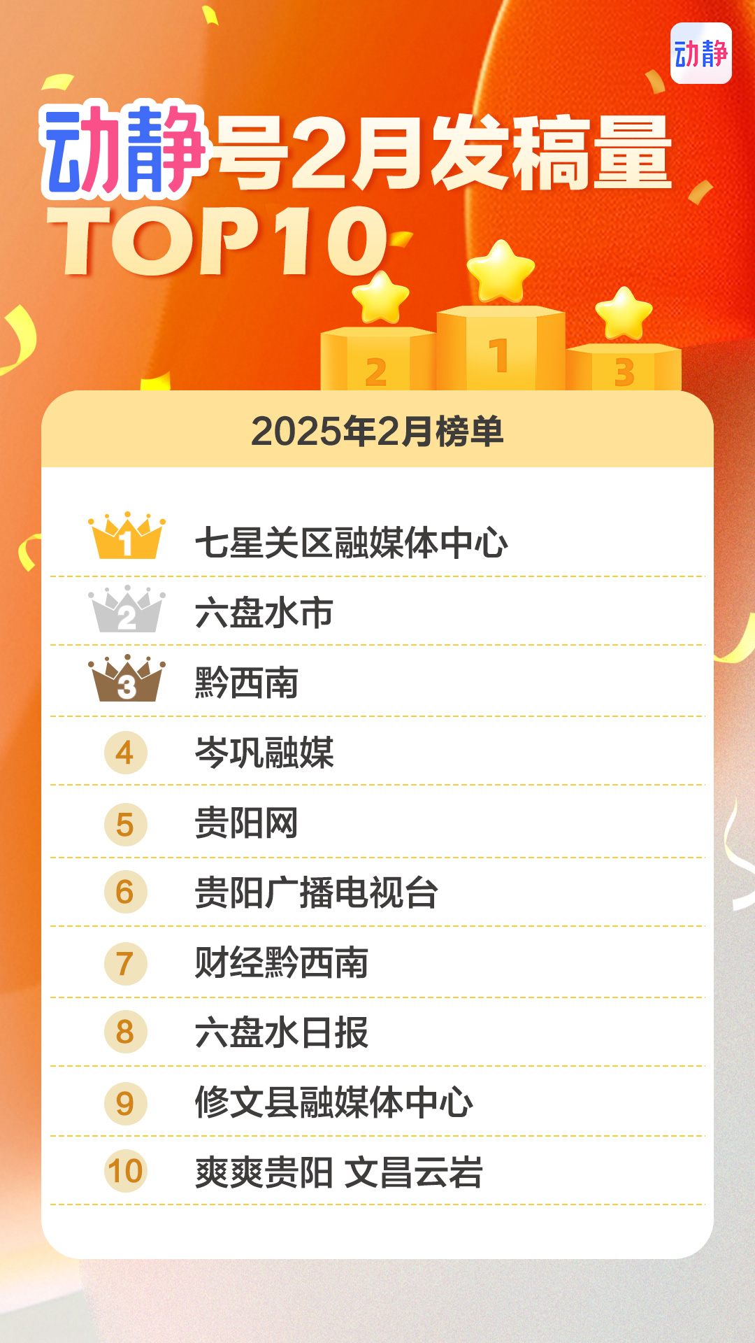 2月发稿数量排行榜中的各个动静号,前三甲的七星关区融媒体中心、六盘水市、黔西南日发稿量都超过了8条。