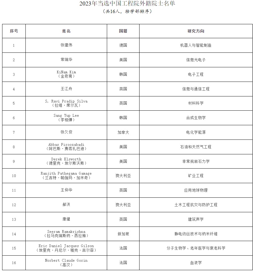此外,中国工程院公布2023年院士增选当选外籍院士名单,共计16人。