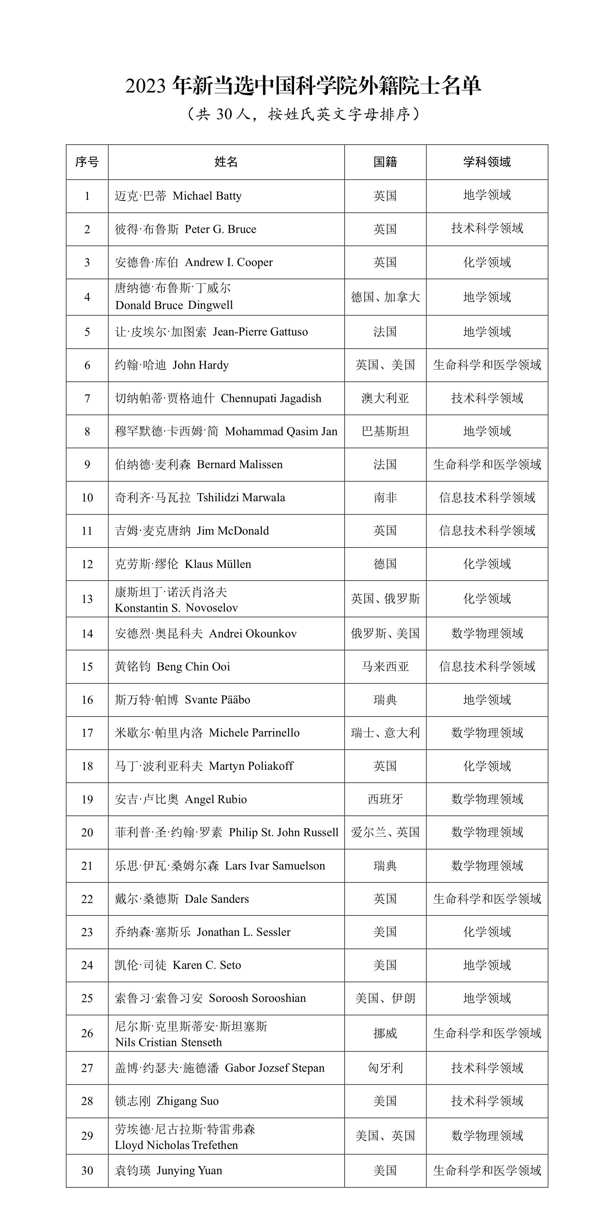 中国科学院11月23日发布公告,根据《中国科学院院士章程》《中国科学院外籍院士选举办法》等规定,2023年中国科学院选举产生了30名中国科学院外籍院士。