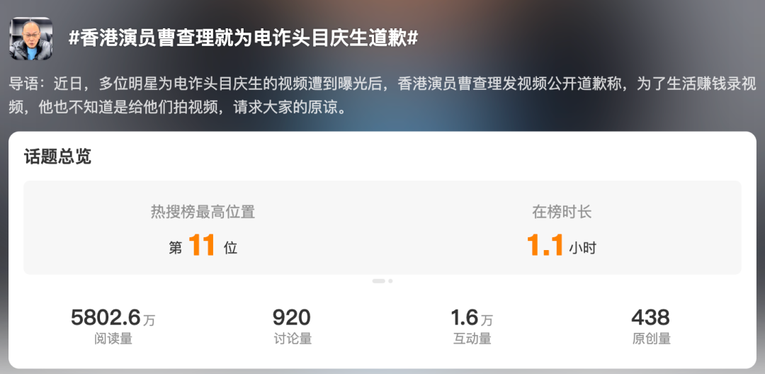 11月16日,香港演员曹查理在个人账号发布视频,就为缅北电诈头目庆生致歉。