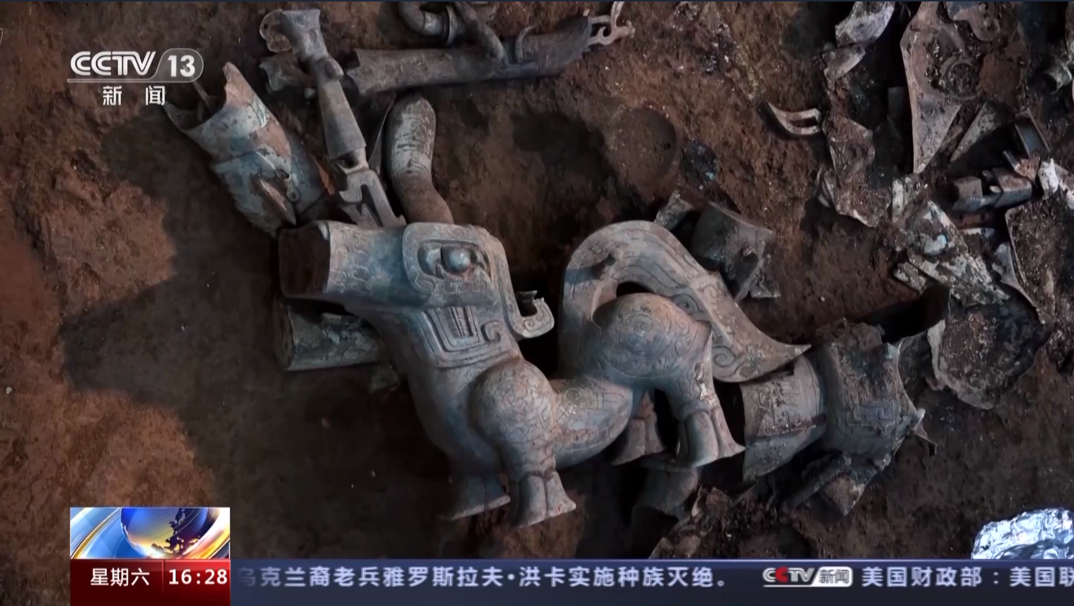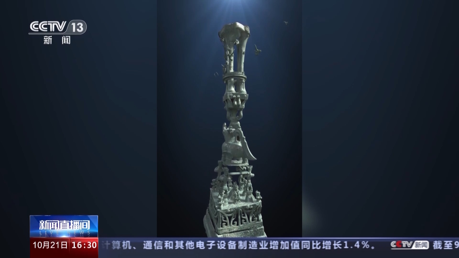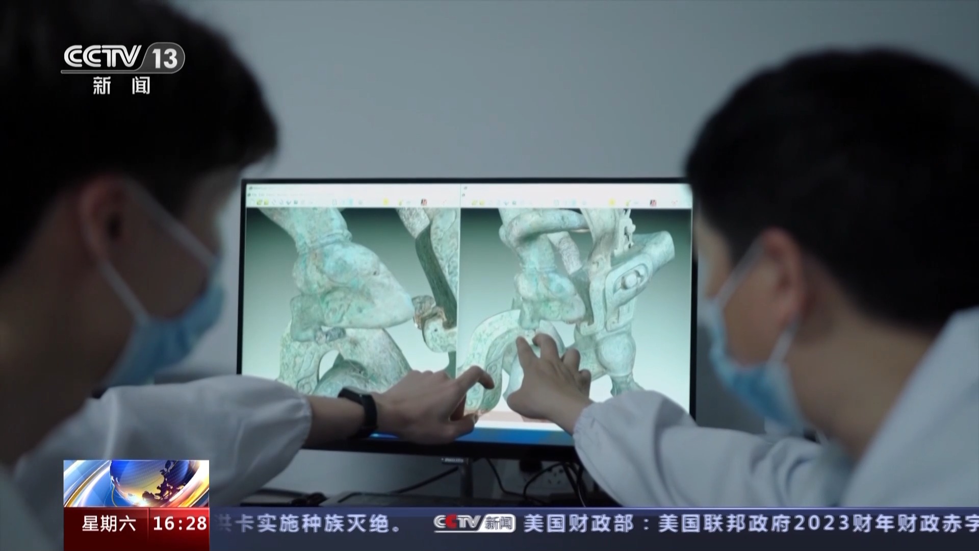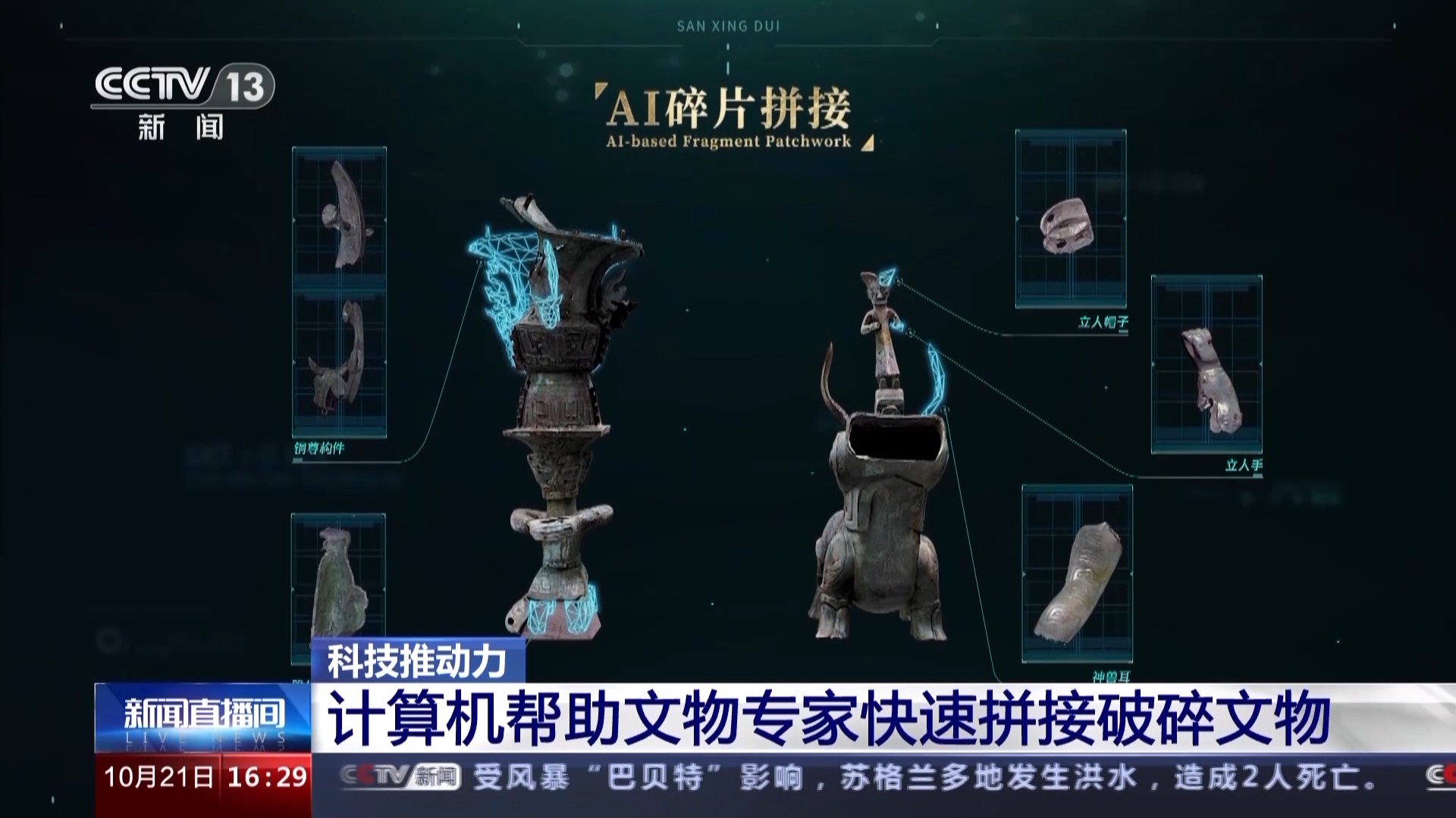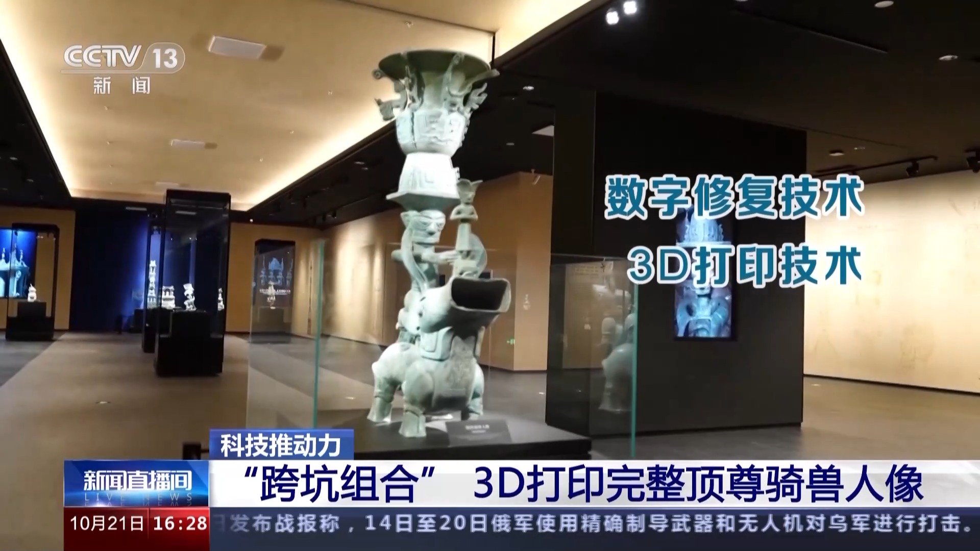 总台央视记者 张春玲:我们知道很多考古发掘出来的文物是破碎的或者变形非常严重的,比如我身后这两个文物,它们分别来自8号坑和3号坑,跨坑组合成一个完整的顶尊骑兽人像。这样一个完整器型如何呈现在观众面前呢?通过最新的数字文物修复技术和3D打印技术,我们可以看到最终一个完整组合好的器型。
