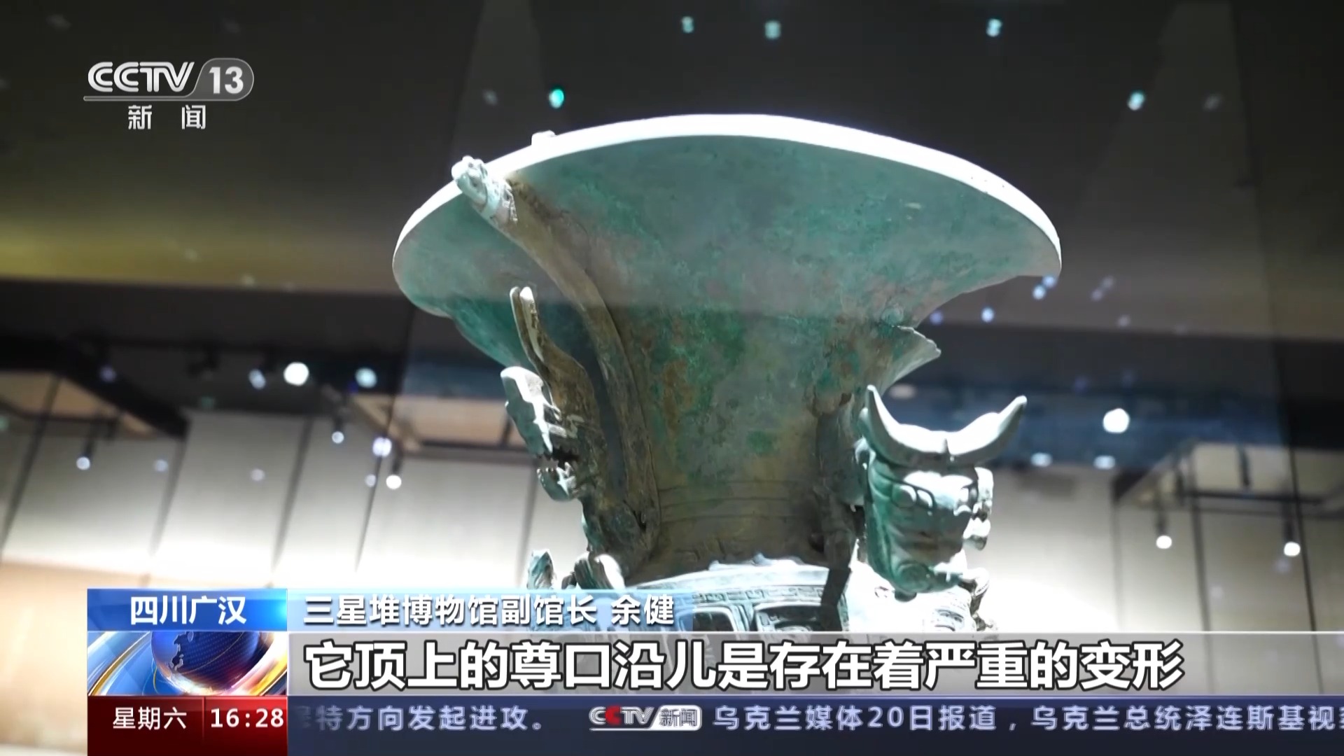 三星堆博物馆副馆长 余健:就拿这件顶尊跪坐人像来说,它最主要的病害就是修复上最难的一个点,首先可以看到它顶上的尊口沿儿存在着严重变形,还有严重的残缺和断裂。对于传统修复工艺来说,要对它进行矫形和补配,花费至少3到6个月的时间。