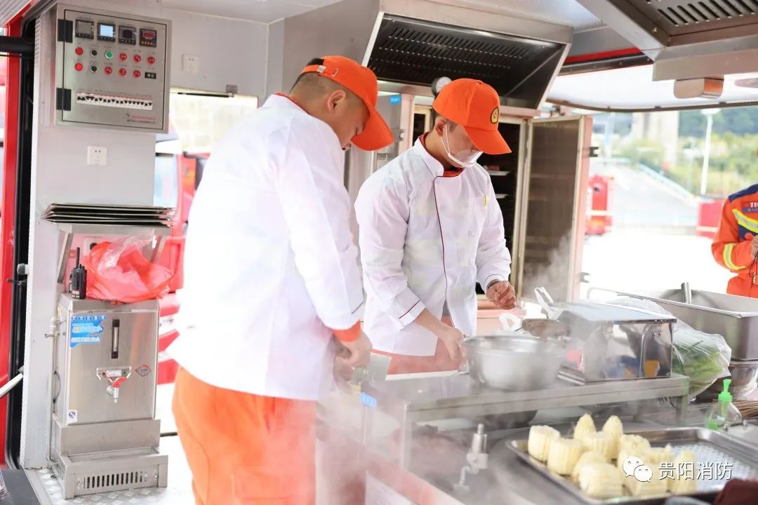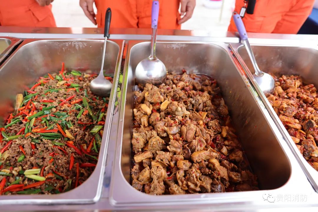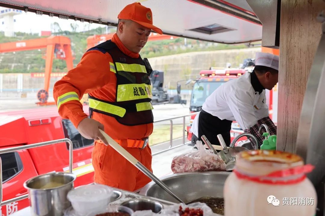 演练期间,支队保障队伍充分结合“黔中片区”参演支队协同保障特点,合理调剂参演人员的喜好营养,立足抢险救灾任务重、身体能量消耗快、营养能量需求高等特点,科学制定饮食保障计划,按照六菜二汤(四荤二素)的标准,精心制作营养成分高、品种式样多的菜品,丰富参演人员营养补给;合理设置能量补给站,制作暖身汤品,丰富保障措施,有效保障恶劣环境下参演人员身体健康,全方位提供营养搭配均衡,色香味俱全,保障物资充足的保障基础,向演练现场参演90余名消防救援人员提供了优质暖心的保障服务。