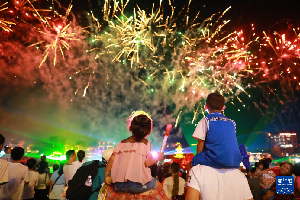 10月1日,游客在贵州省黔东南苗族侗族自治州凯里市下司古镇观赏烟花。新华社发(吴贤燕 摄)