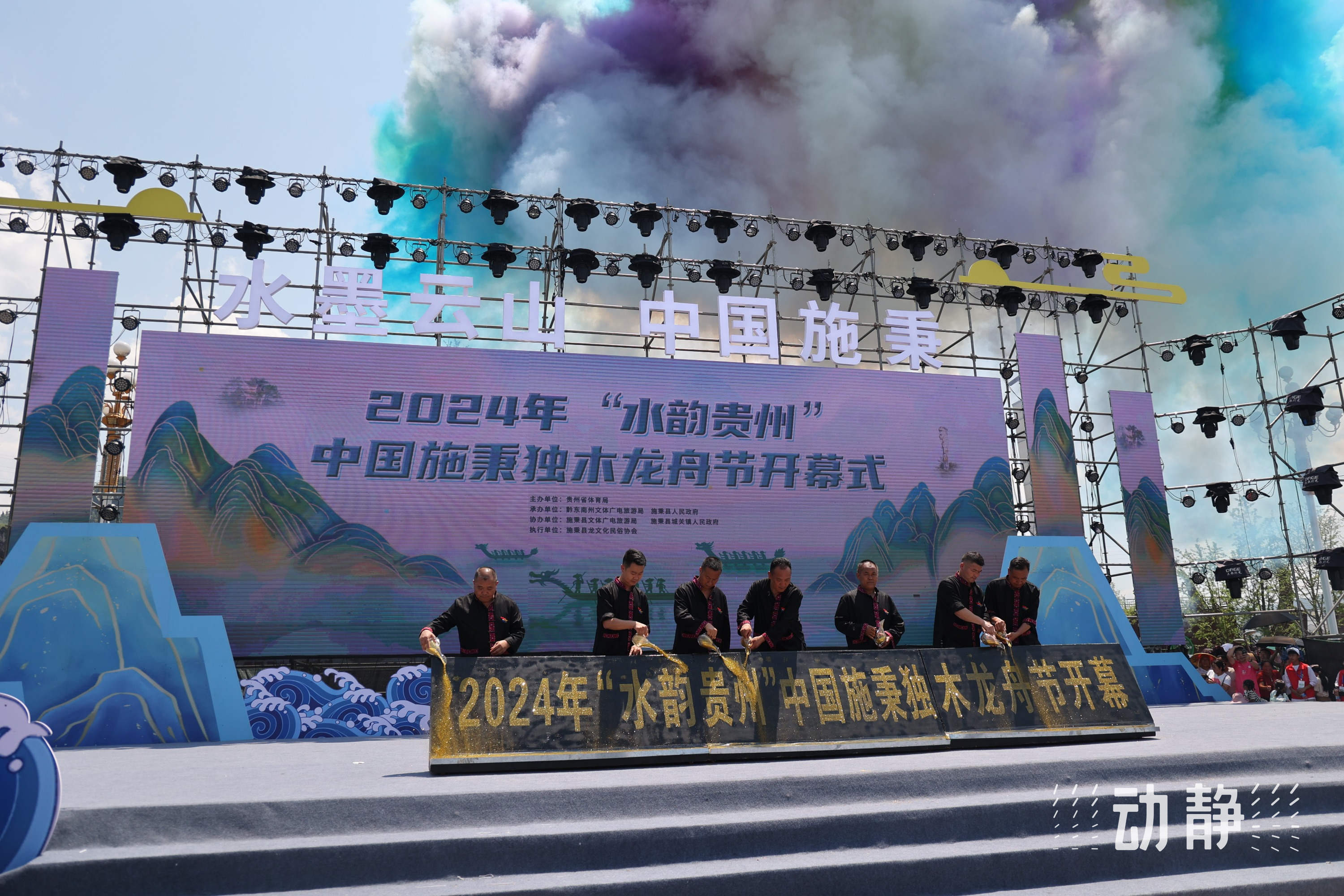 6月15日,2024年“水韵贵州”中国施秉独木龙舟节开幕,千名壮汉抬98.8米木龙舟沿街巡游入江展演,万人齐聚水舞云台音乐喷泉广场品尝苗家长桌宴,吸引大批游客前来观赏体验。