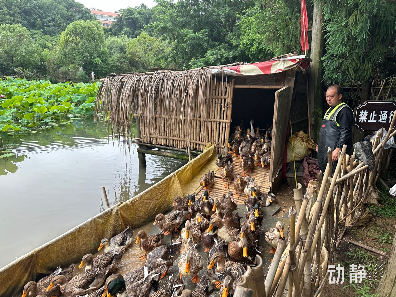 贵州兴艺景生态景观工程股份有限公司项目经理罗斌给记者算了一笔账:“如果使用农药治理福寿螺,一平方是六块钱。这个荷花池5000平方,一年要花三万块。现在使用鸭子来治理福寿螺,100只鸭子的成本是1500元,加上饲料一年是二万四,总共是二万五千块钱。100只鸭子养大以后,还可以卖至少一万块钱。从经济角度来考虑,鸭子要比使用农药便宜一半的价钱,并且农药对环境有污染,而鸭子对生态环境没有任何影响,还可以治理浮漂和水草,改善水质,效益更高。”