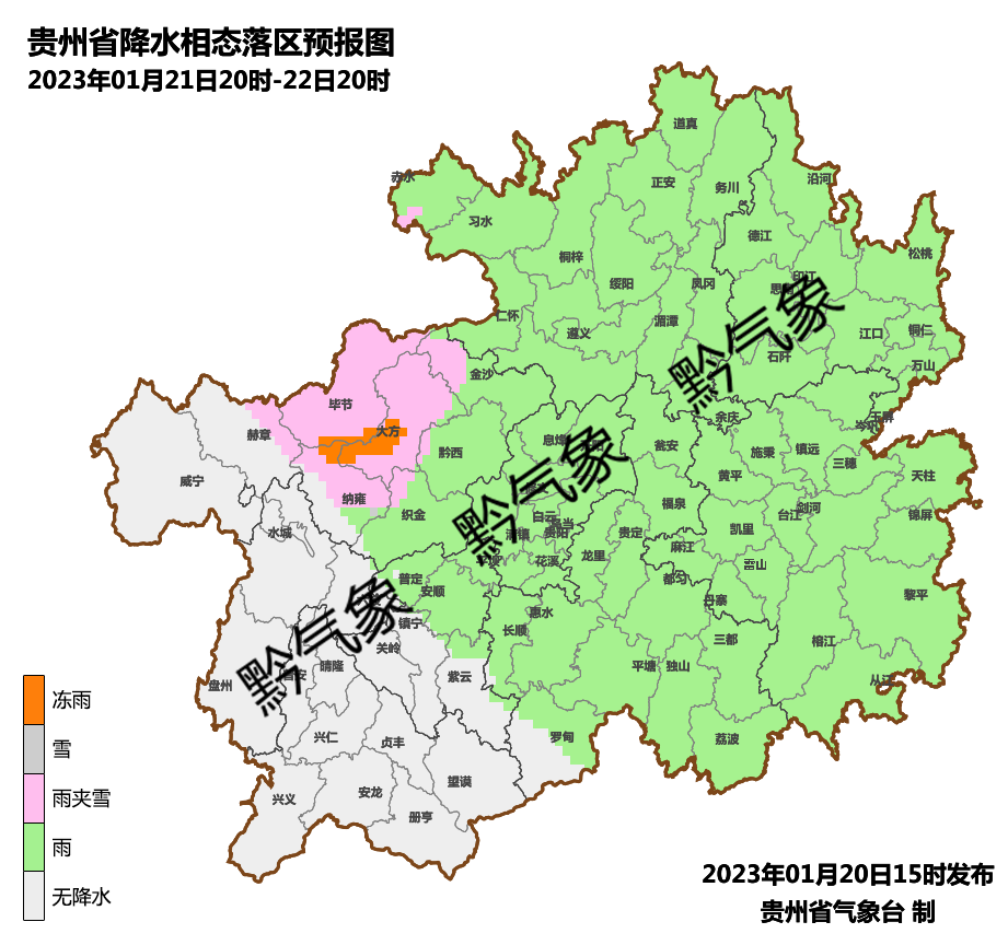 21日夜间到22日白天,省的西部地区多云,其余地区阴天有小雨,毕节市东部地势高处有零星雨夹雪或冻雨;