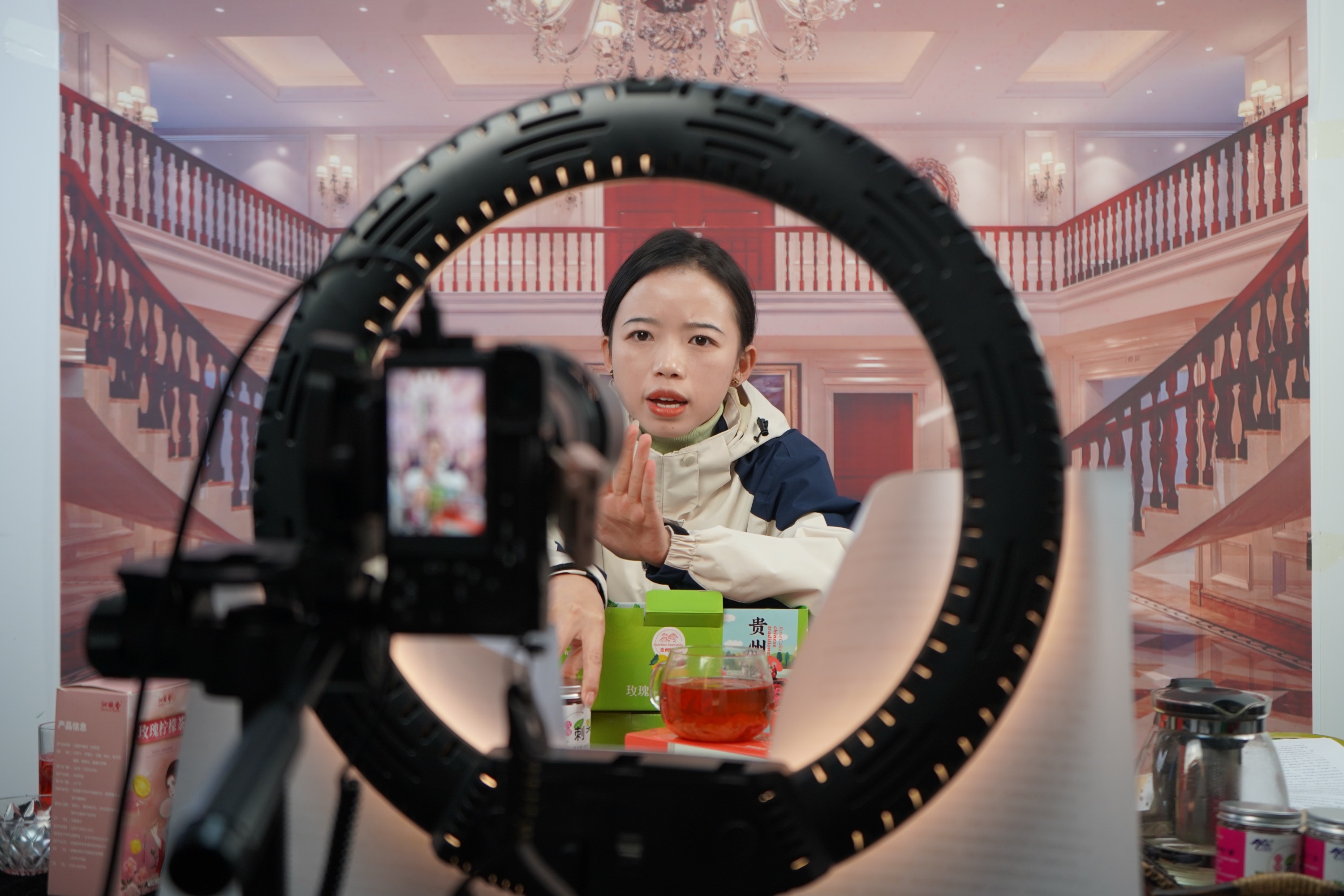 “家人们,看我手里的玫瑰刺梨酱,是我们今年8月才生产出来的新品,里面富含花青素和维生素C,特别适合爱美的女性喝......”