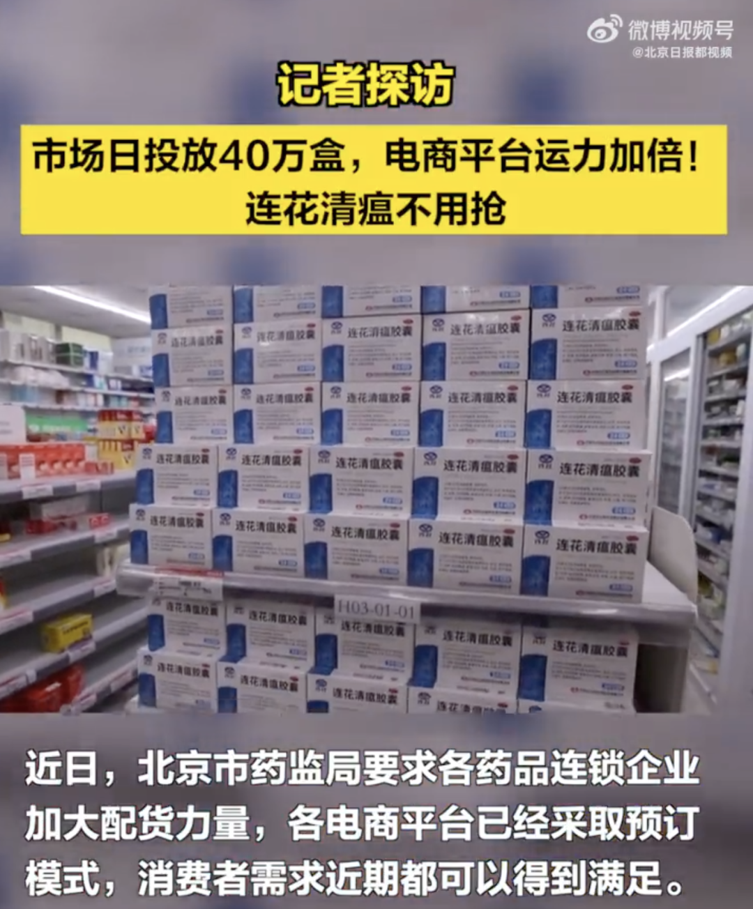 据北京晚报消息,记者从北京市药监局了解到,为了满足市民的购药需求,北京市每日投放市场“连花清瘟”颗粒和胶囊共40万盒左右,优先面向开设在居民社区、超市内等人流密集、销售能力强的药店,以及社区卫生服务中心供货,并将逐步扩展至北京市所有药店。