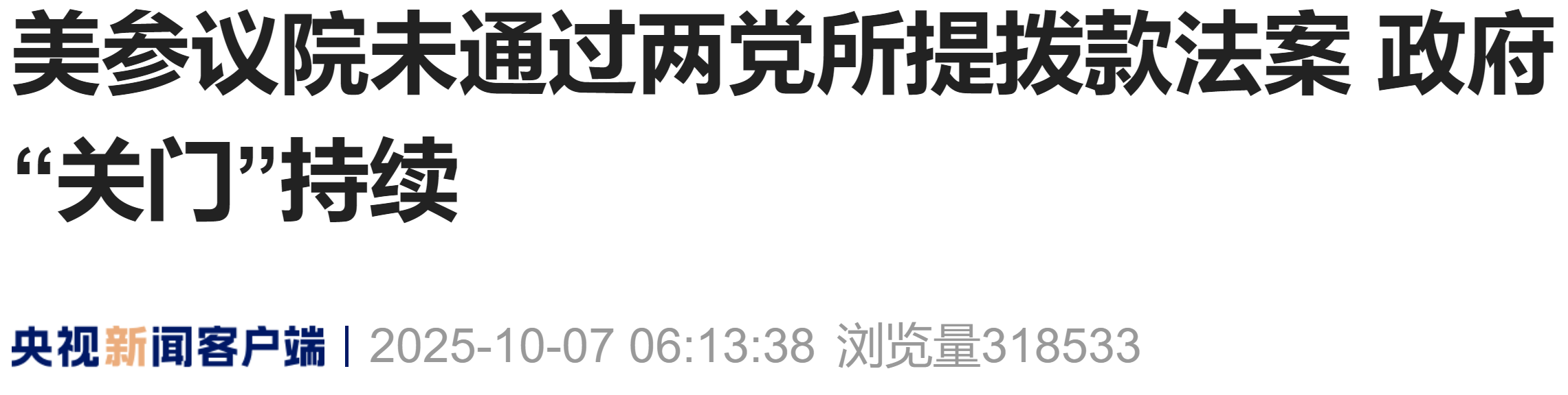 当地时间10月6日,美国国会参议院对民主党提出的旨在结束政府“关门”的拨款法案进行表决,最终以45票赞成、50票反对,法案未获通过。