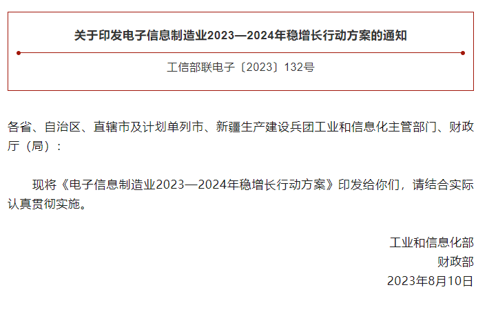电子信息制造业是国民经济的战略性、基础性、先导性产业,规模总量大、产业链条长、涉及领域广,是稳定工业经济增长、维护国家政治经济安全的重要领域。为贯彻落实党的二十大和中央经济工作会议精神,更好发挥电子信息制造业在工业行业中的支撑、引领、赋能作用,助力实现工业经济发展主要预期目标,特制定本方案,实施期限为2023—2024年。本方案所指电子信息制造业包含计算机、通信和其他电子设备制造业以及锂离子电池、光伏及元器件制造等相关领域。