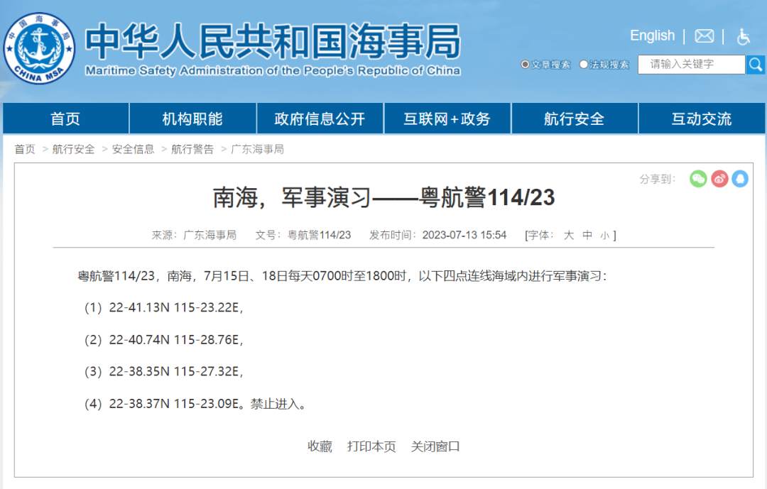 据中国海事局网站消息,广东海事局发布航行警告,7月15日、18日每天7时至18时,南海部分海域进行军事演习,禁止驶入。