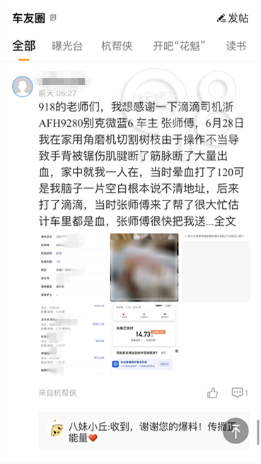 近日,刘先生(化名)在某APP中发帖,感恩一路上的“温暖”。