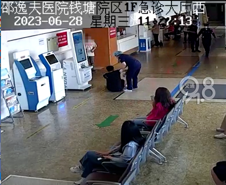 十分钟左右,刘先生被安全送到了浙大邵逸夫医院钱塘院区,急诊护士、保安大哥冲了过来,将刘先生送往急诊进行救治。