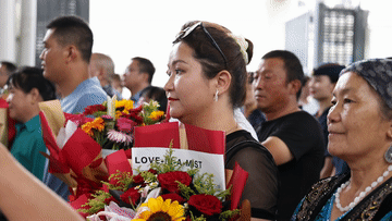 “欢迎回家!”8月7日,乌鲁木齐站16号站台充满鲜花与掌声。