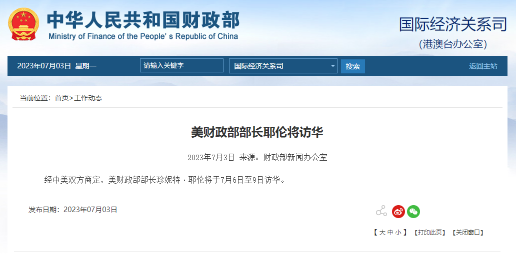 据财政部网站3日消息,经中美双方商定,美财政部部长珍妮特·耶伦将于7月6日至9日访华。
