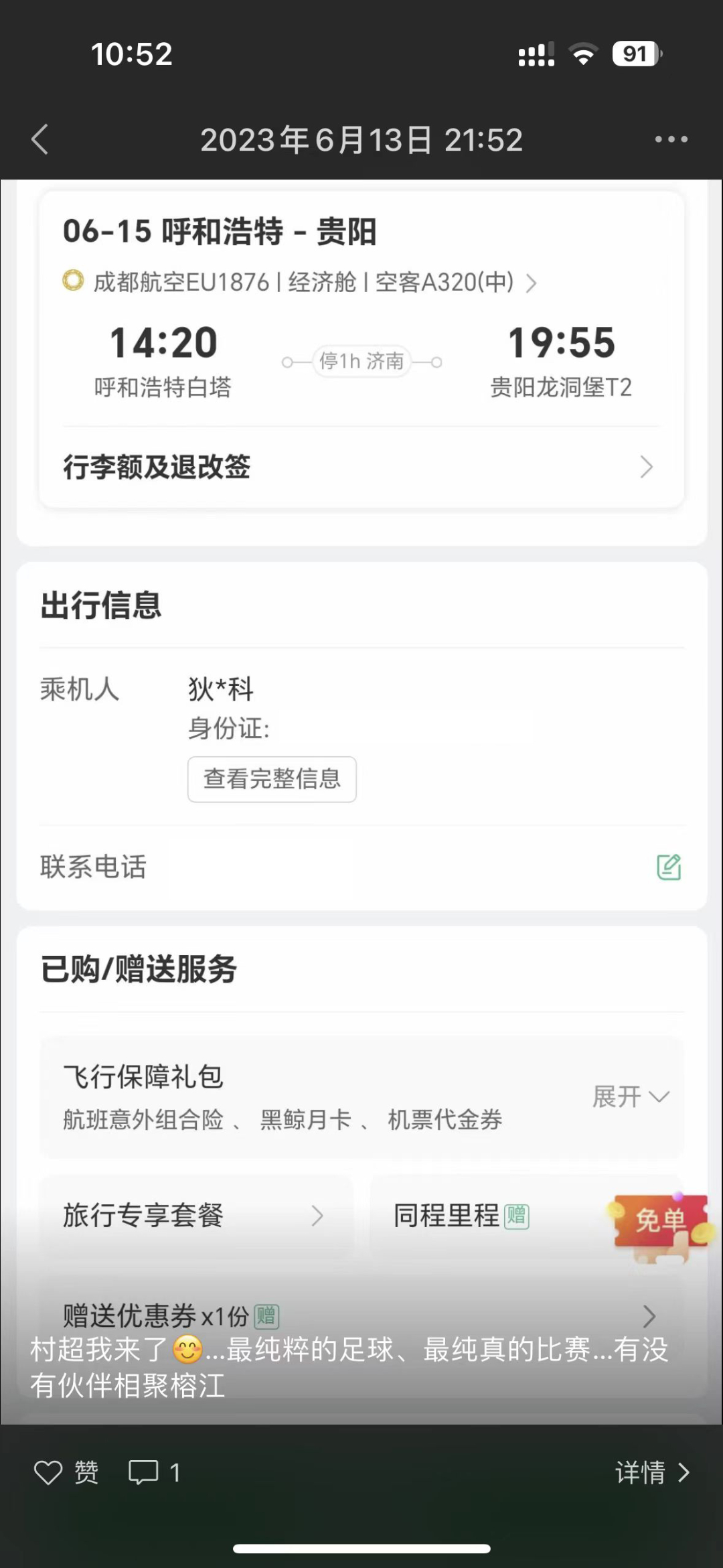 “村超我来了……”这是狄文科订票后立刻发出的一条朋友圈