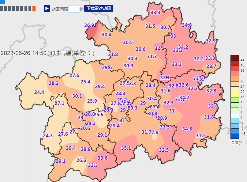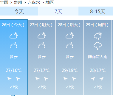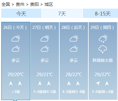 今天夜间到明天白天,全省多云到晴,南部和东部有分散阵雨或雷雨,省的东部边缘个别县市及赤水河谷午后有35℃以上高温;