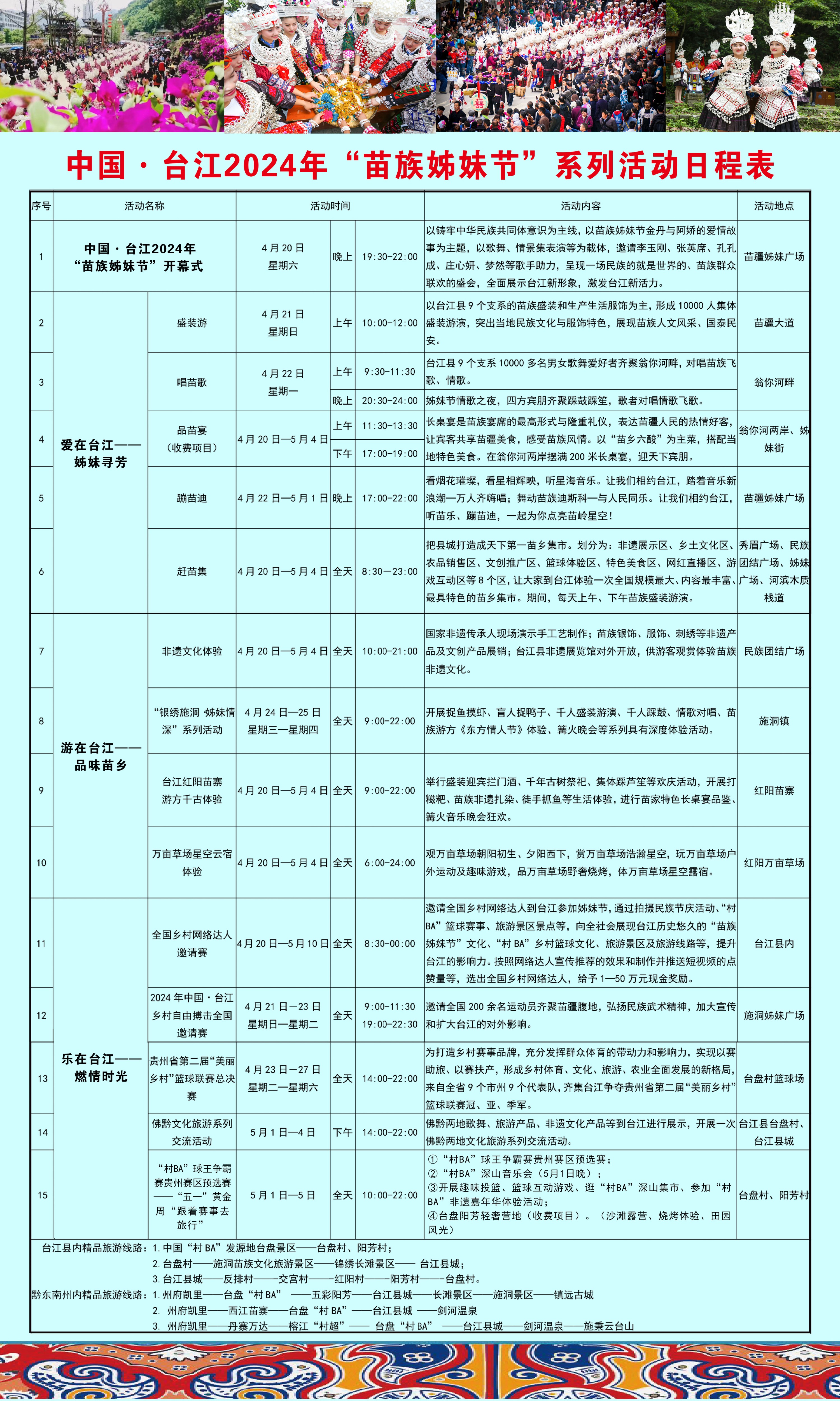 内容:把县城打造成天下第一苗乡集市。划分为:非遗展示区、乡土文化区、农品销售区、文创推广区、篮球体验区、特色美食区、网红直播区、游戏互动区等8个区,让大家到台江体验一次全国规模最大、内容最丰富、最具特色的苗乡集市。期间,每天上午、下午苗族盛装游演。