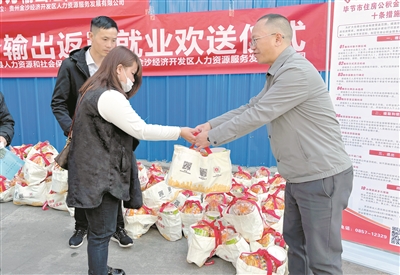 在金沙县客运站,外出务工人员早早来到乘车地点,在工作人员的引导下,核对返岗信息,领取装有零食、方便面等生活用品的爱心礼包。