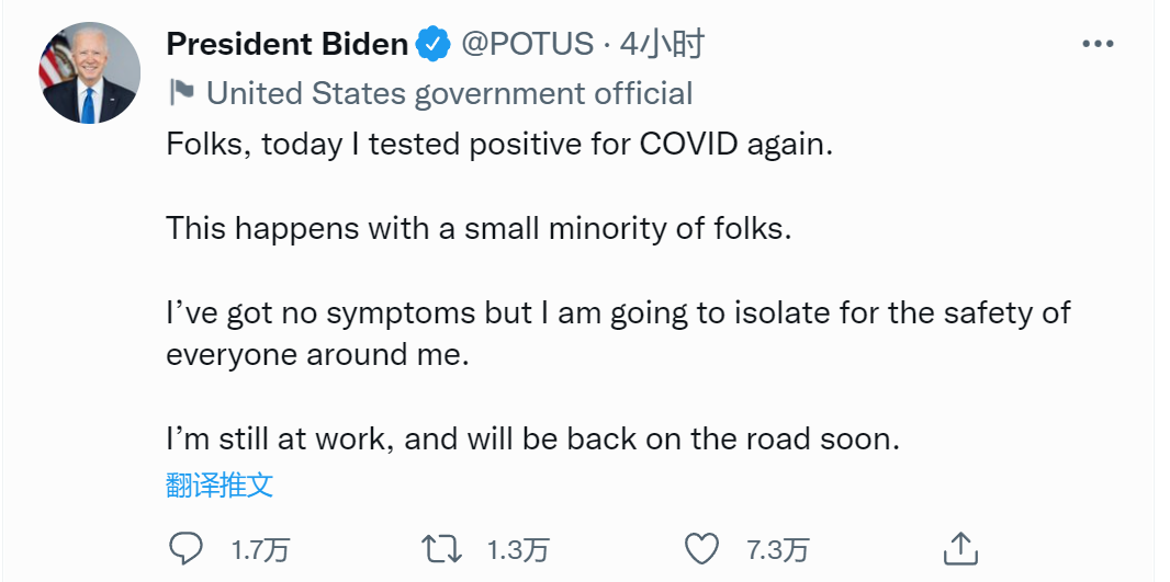 复阳后,拜登发推:“这种情况只会发生在少数人身上”